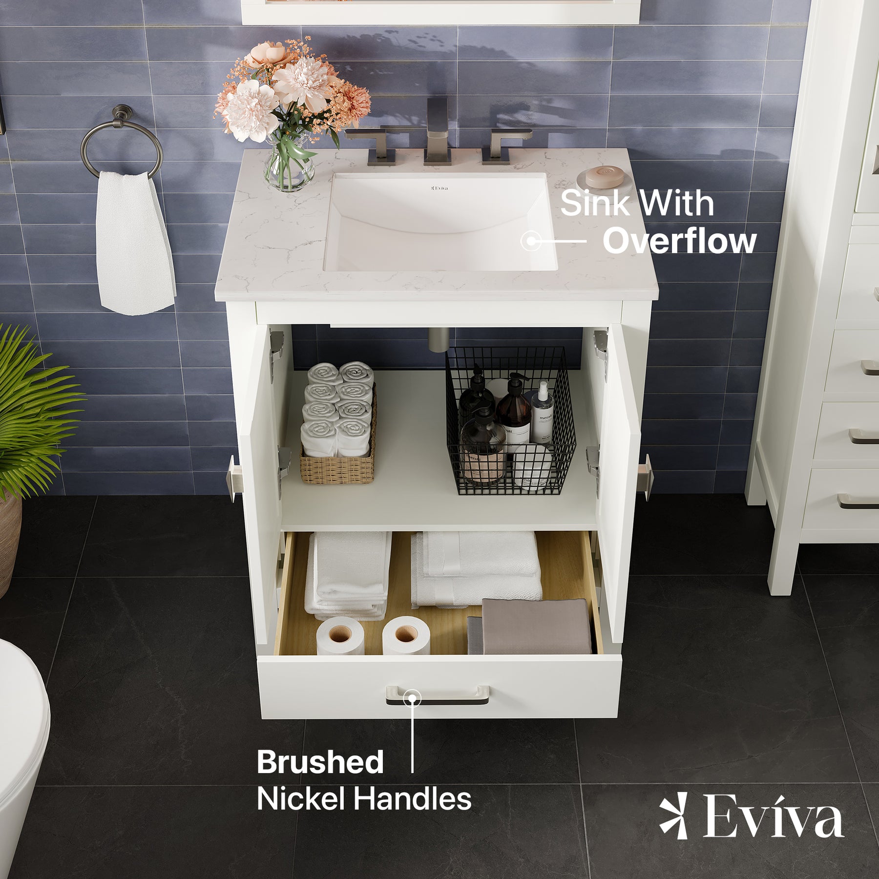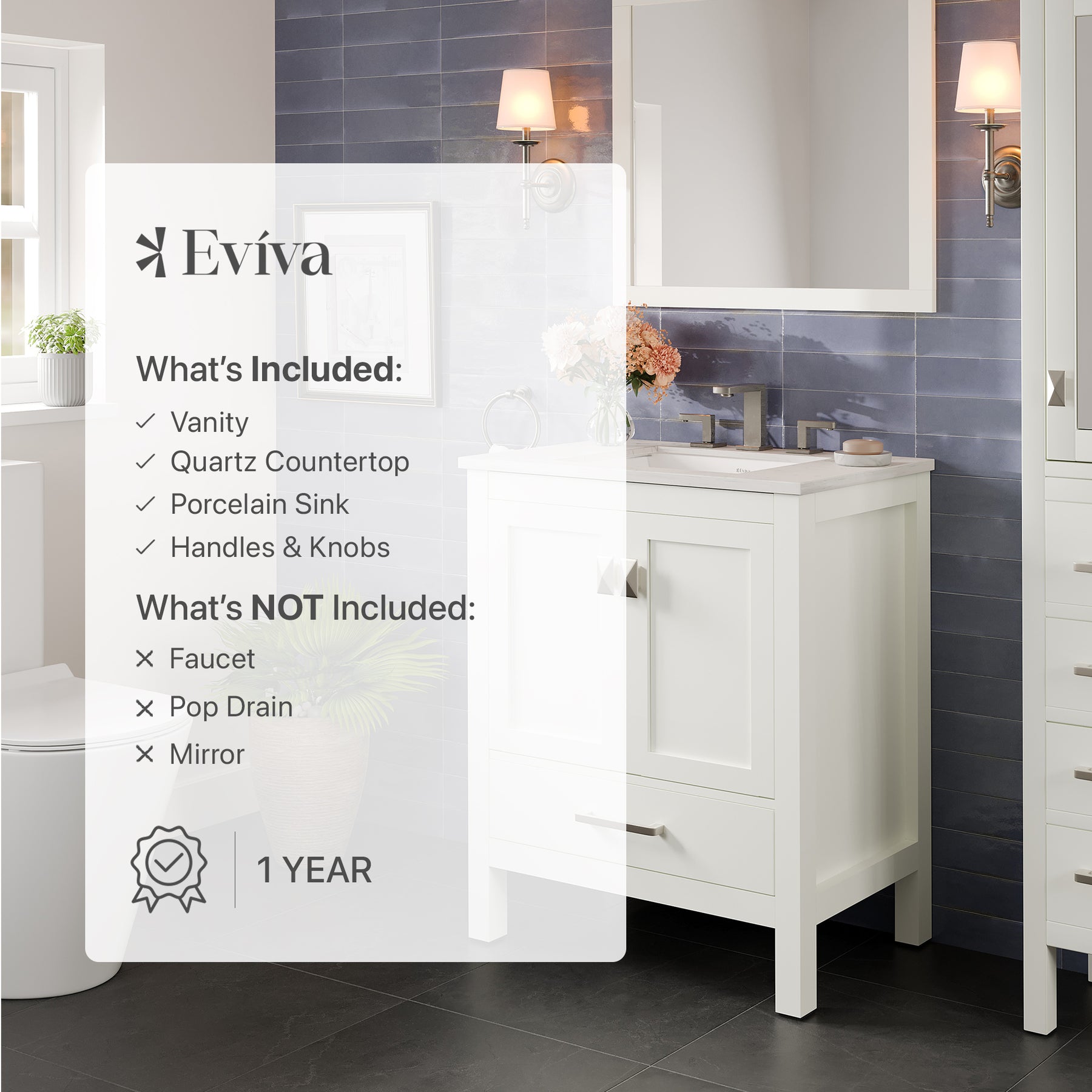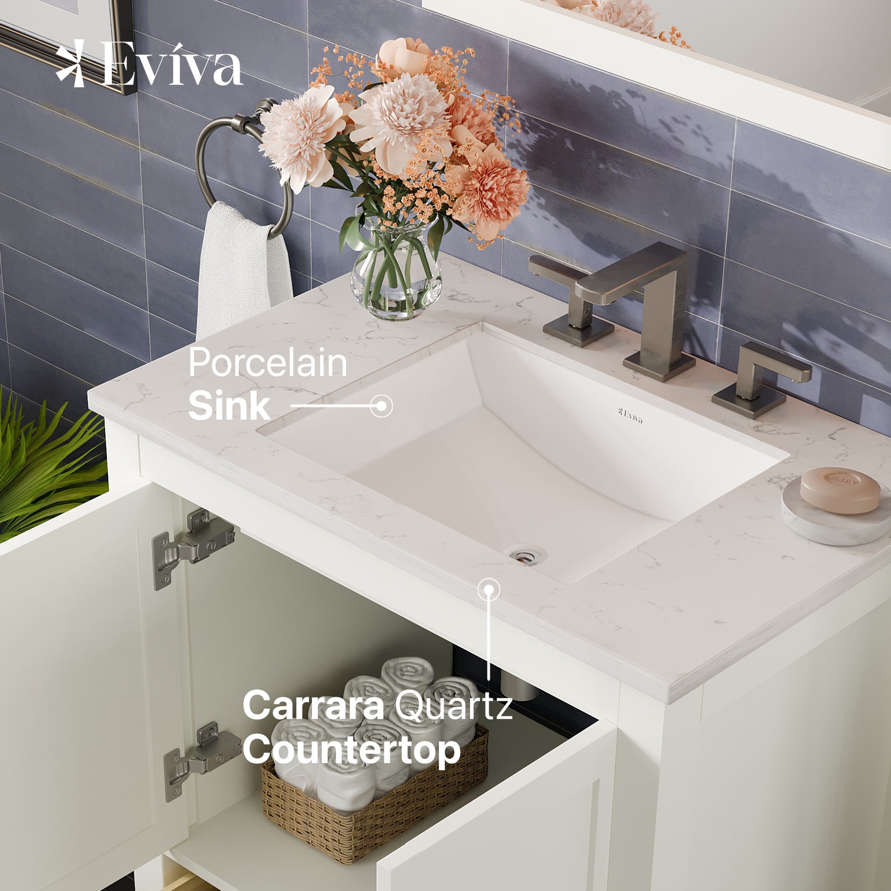 The Eviva Aberdeen bathroom vanity combines traditional and modern styles for a distinctive, sophisticated look that complements any bathroom. The Aberdeen is constructed of high-grade solid wood, a luxurious stain-resistant & maintenance-free White Carrara Quartz countertop with a Pre-drilled 3-hole 8″ widespread faucet mount, and an undermount porcelain sink. Offering an impressive storage capacity including 5 soft-closing full-extension solid pine wood dovetail drawers and 2 doors with spacious shelves, the Aberdeen is perfect for storing all of your bathroom essentials. Premium stainless steel brushed nickel hardware adds a touch of elegance to the vanity’s aesthetic. The cabinet arrives fully assembled & ready for an easy installation. The Aberdeen is available in widths of 24″, 30”, 36”, 42”, 48”, 54”, 60” 72”, 78”, and 84″ with a depth of 22″, beautiful finishes of White, Gray, Espresso, and Blue, with both single and double sink options.