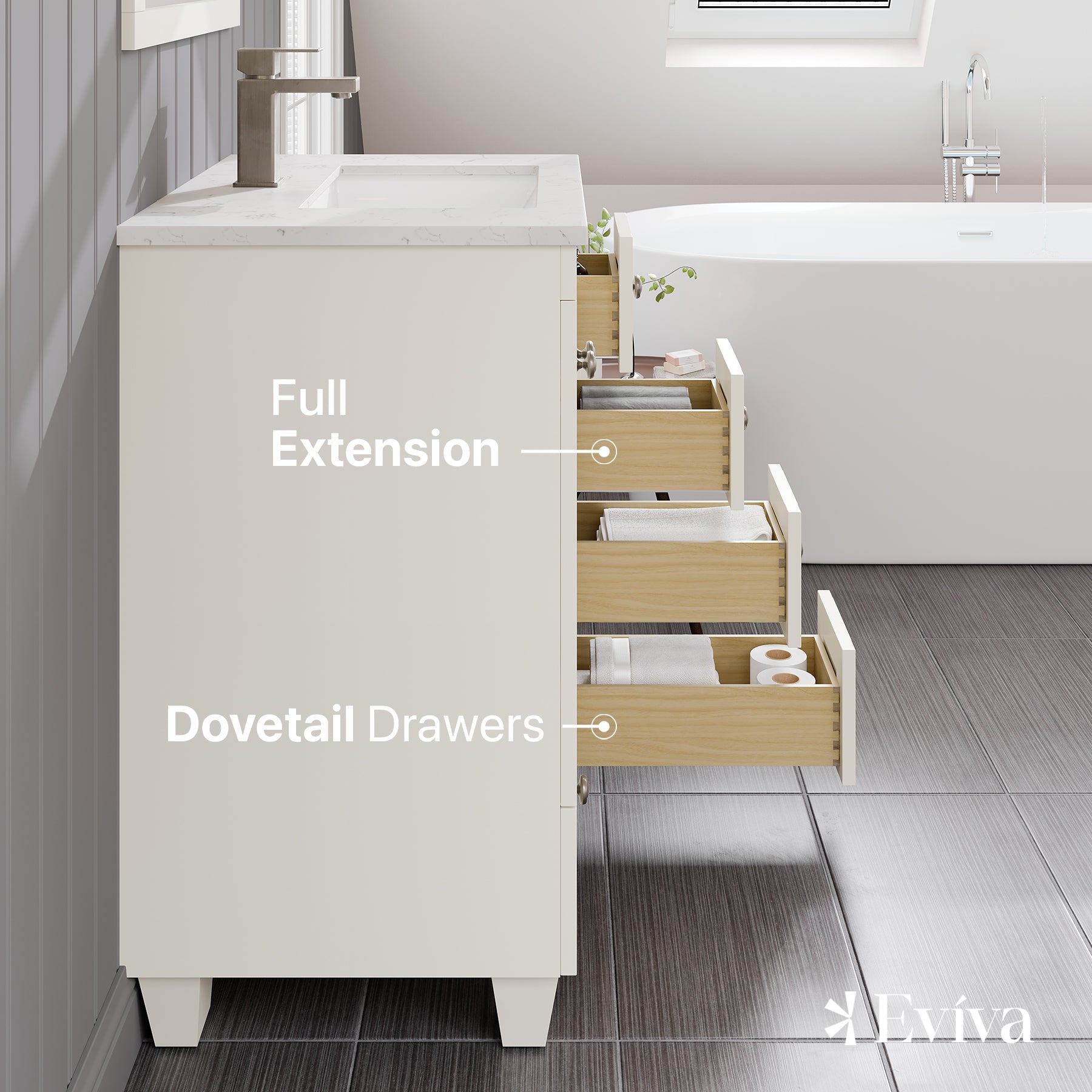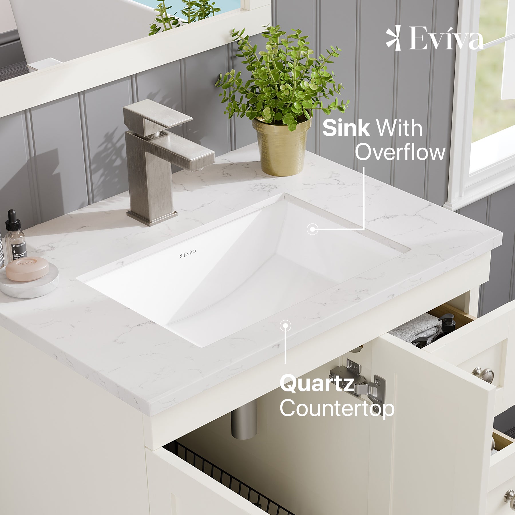 The Eviva Acclaim vanity features a luxurious stain-resistant & maintenance-free White Carrara Quartz countertop with a pre-drilled single-hole faucet mount, under mount porcelain sink, and 22” depth. Crafted with solid wood and engineered wood to prevent warping and chipping, the Acclaim’s sleek and functional design is accentuated by its 5 soft-closing full-extension solid pine wood dovetail drawers and 2 doors with spacious shelves, providing superb storage capacity in a compact vanity to store all of your bathroom or powder room essentials in a small space. The Acclaim has premium stainless steel brushed nickel hardware which provides a clean, elegant look. The cabinet arrives fully assembled & ready for an easy installation. The Acclaim is available in widths of 24″, 28″, and 30″, with a 22″ depth, and is available in beautiful finishes of White, Gray, Espresso, Dark Gray, Teak, and Blue.