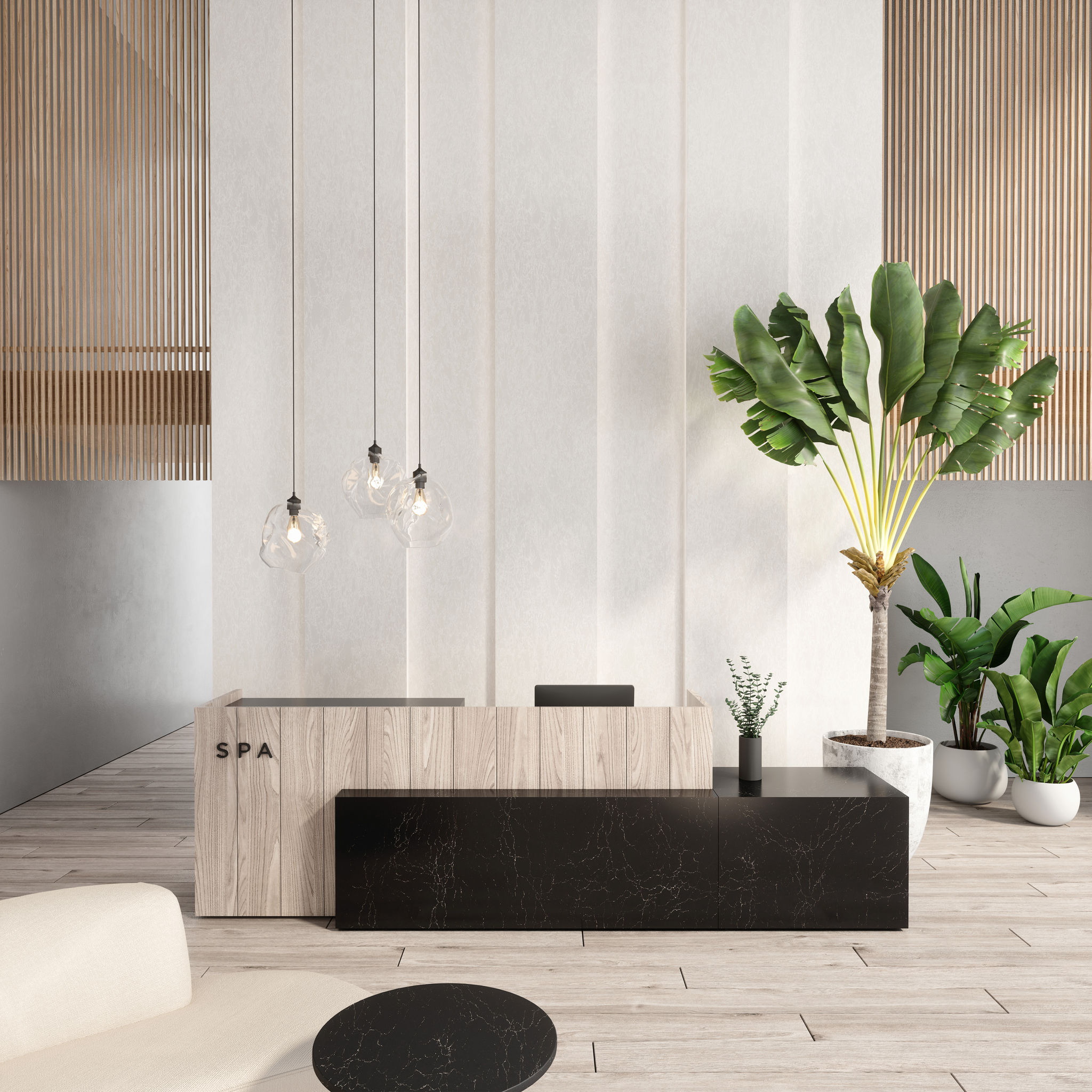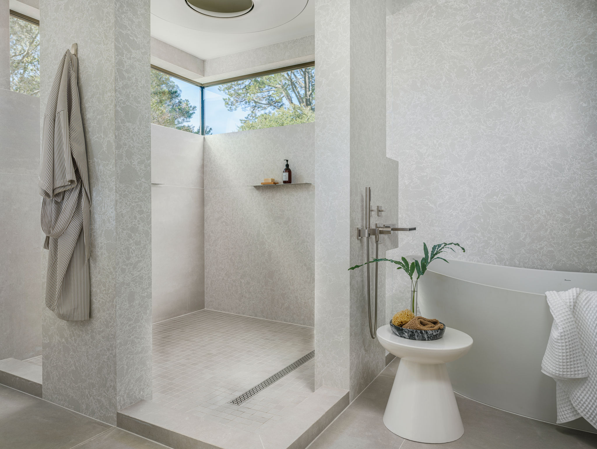Graceful white swirls and delicate dove-gray shapes accentuate a warm, beige backdrop, giving this design a timeless and calming sensibility.