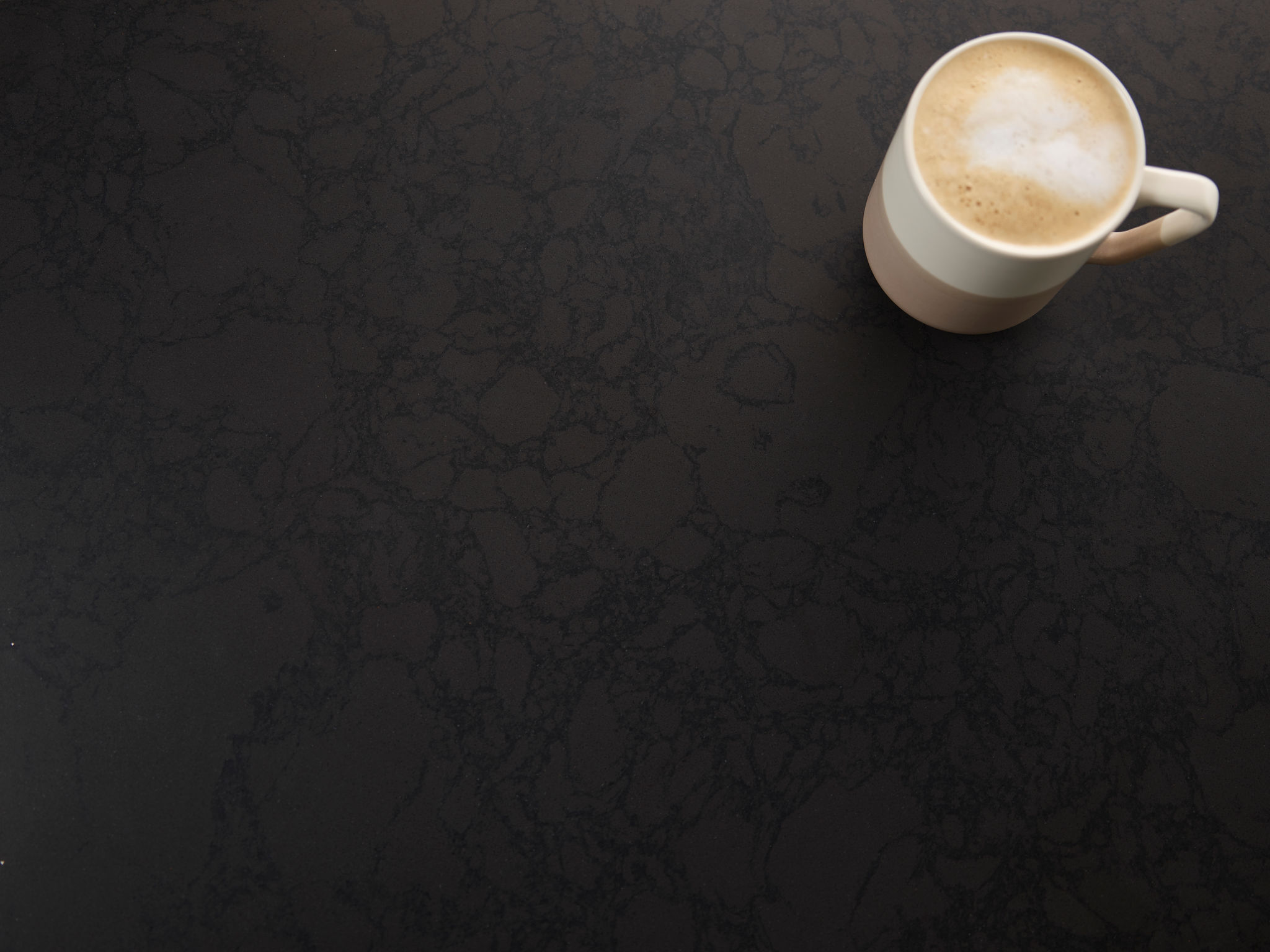 Charcoal veins form abstract shapes on a dense black background in this design named for Black Rock, Arkansas. Gensler product design consultant.