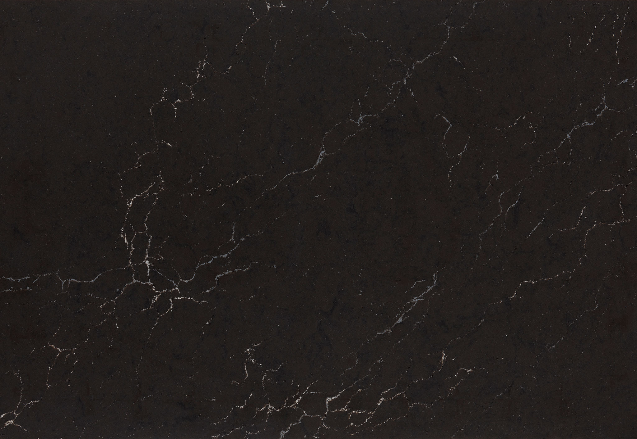 The dark and dramatic charcoal gray surface of Charlestown is imprinted with meandering gray and white veining above faint black currents that ripple below the surface.