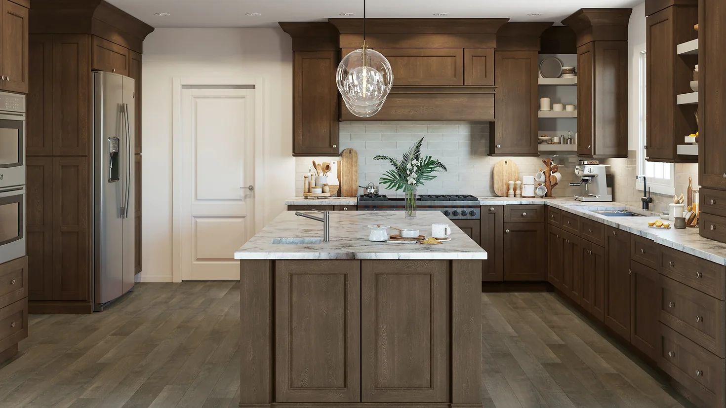Our stained Kona finish accentuates each cabinet’s unique wood grain in a beautiful shade of walnut brown.