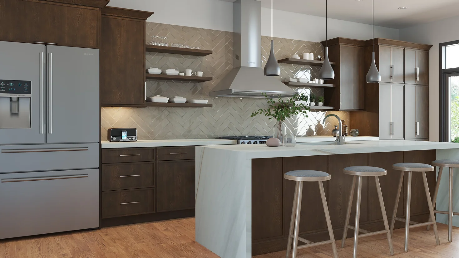 Our stained Kona finish accentuates each cabinet’s unique wood grain in a beautiful shade of walnut brown.