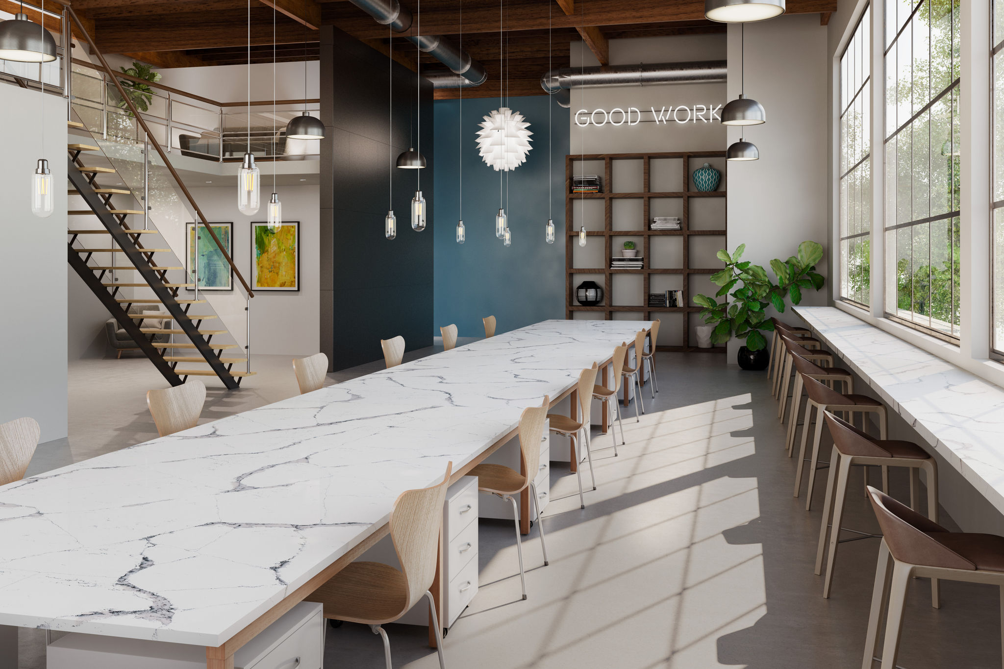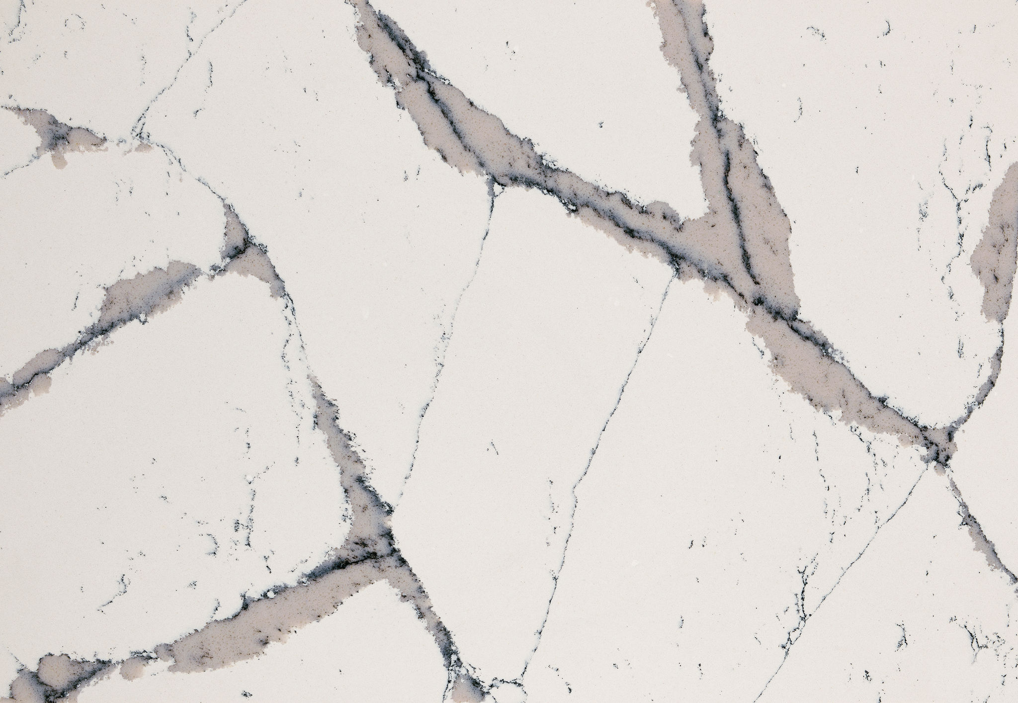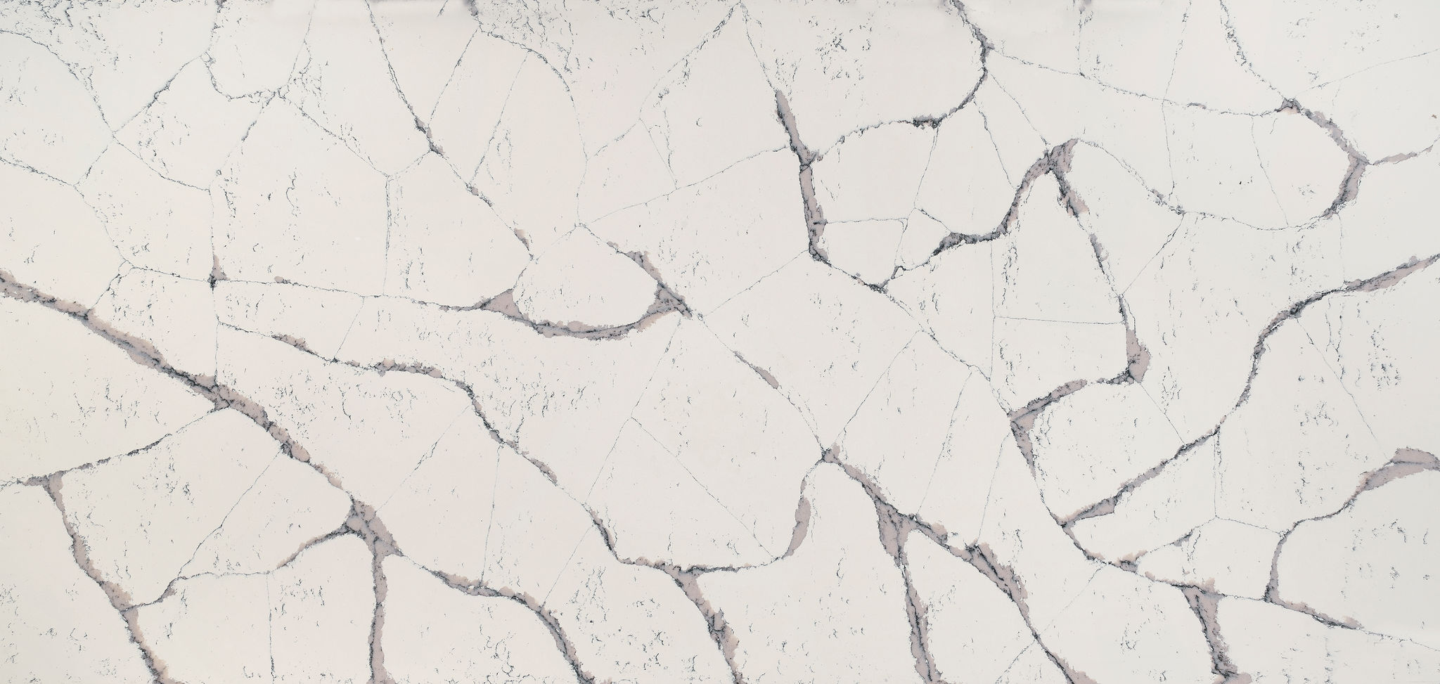 Harrogate offers a pale creamy base accentuated with black and dark greige veins, dark clusters, and delicate gray filaments that form geometric sections.