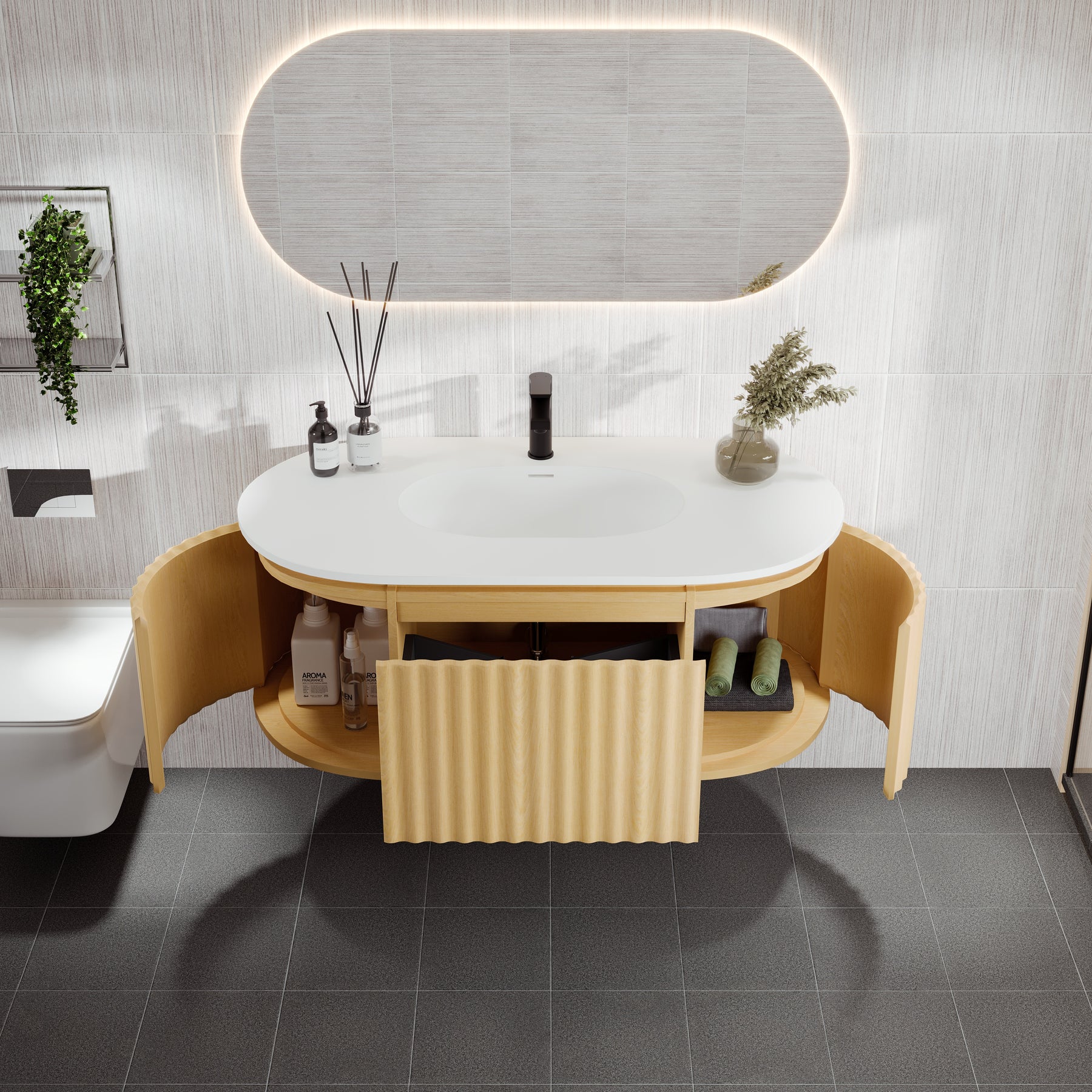The Eviva Haven Natural Oak wall-mounted bathroom vanity exudes modern elegance with its seamless design and rounded edges. The front features a striking fluted pattern, showcasing vertical grooves that add texture and contrast with the rounded edges. The Haven is crafted with real wood and finished with a solid natural Oak wood veneer, giving the cabinet a textured, natural look. Its wall-mounted, floating design enhances the sense of space and openness in any bathroom. Topped with a pristine solid surface countertop with an integrated sink, the Haven’s top resists stains and is maintenance-free. The Haven features unique side-hinged outward opening soft closing doors and a fully extending soft closing drawer. The cabinet arrives fully assembled, allowing for an easy installation. The Haven is available in widths of 39″, 48″, 55″, 64″, and 71″ in beautiful finishes of Natural Oak, Medium Oak, and Green, with both single and double sink options, as well as a 20″ pedestal sink.