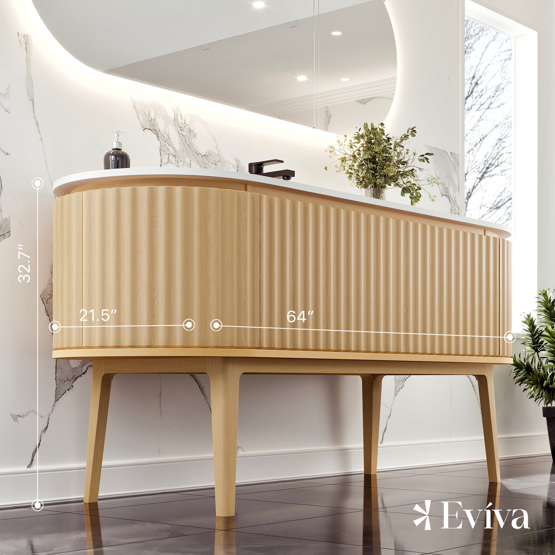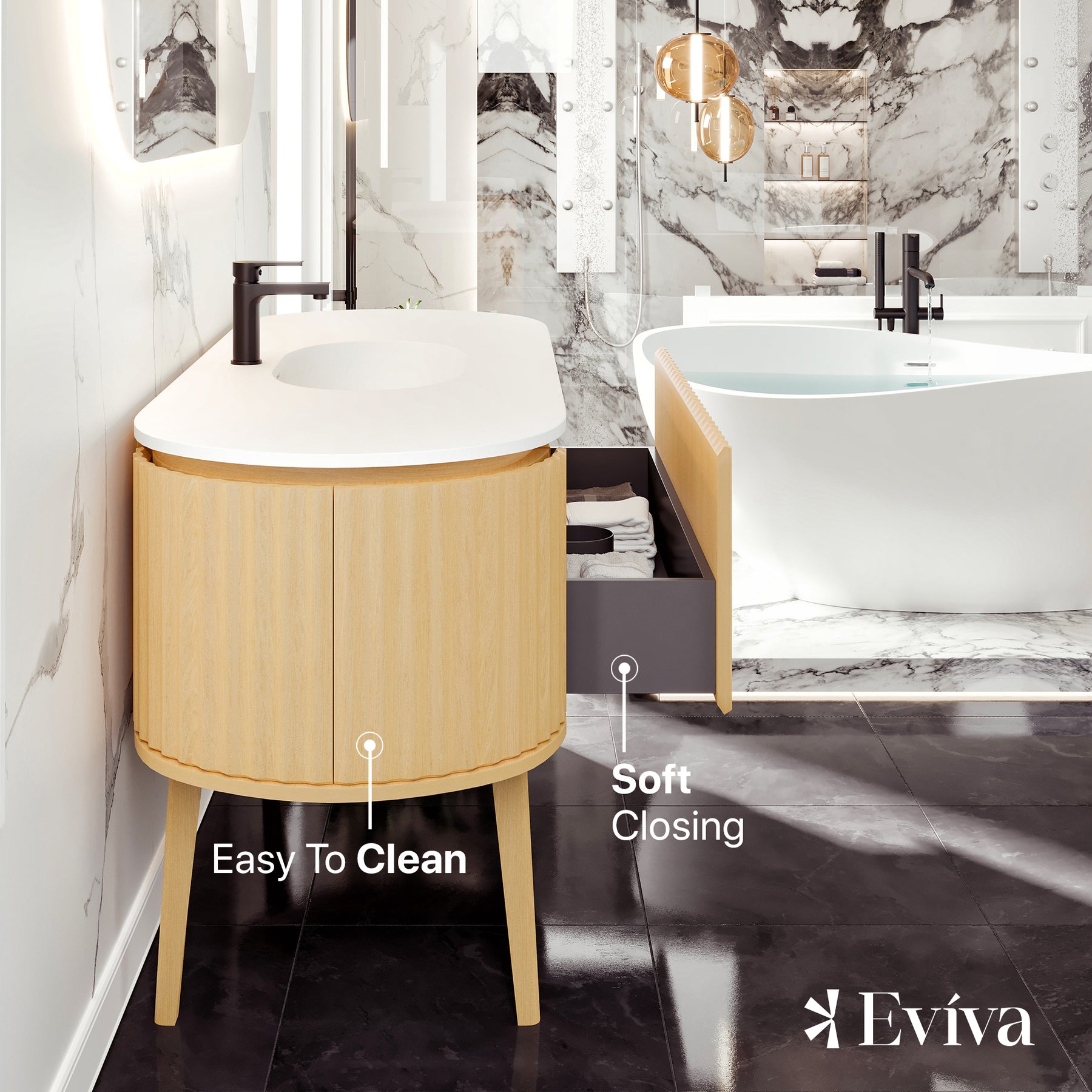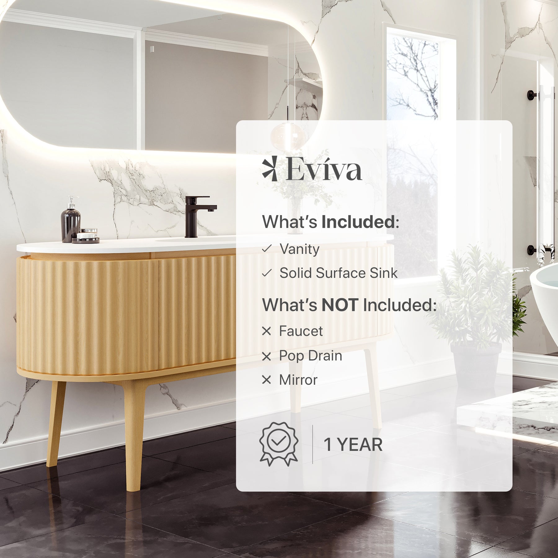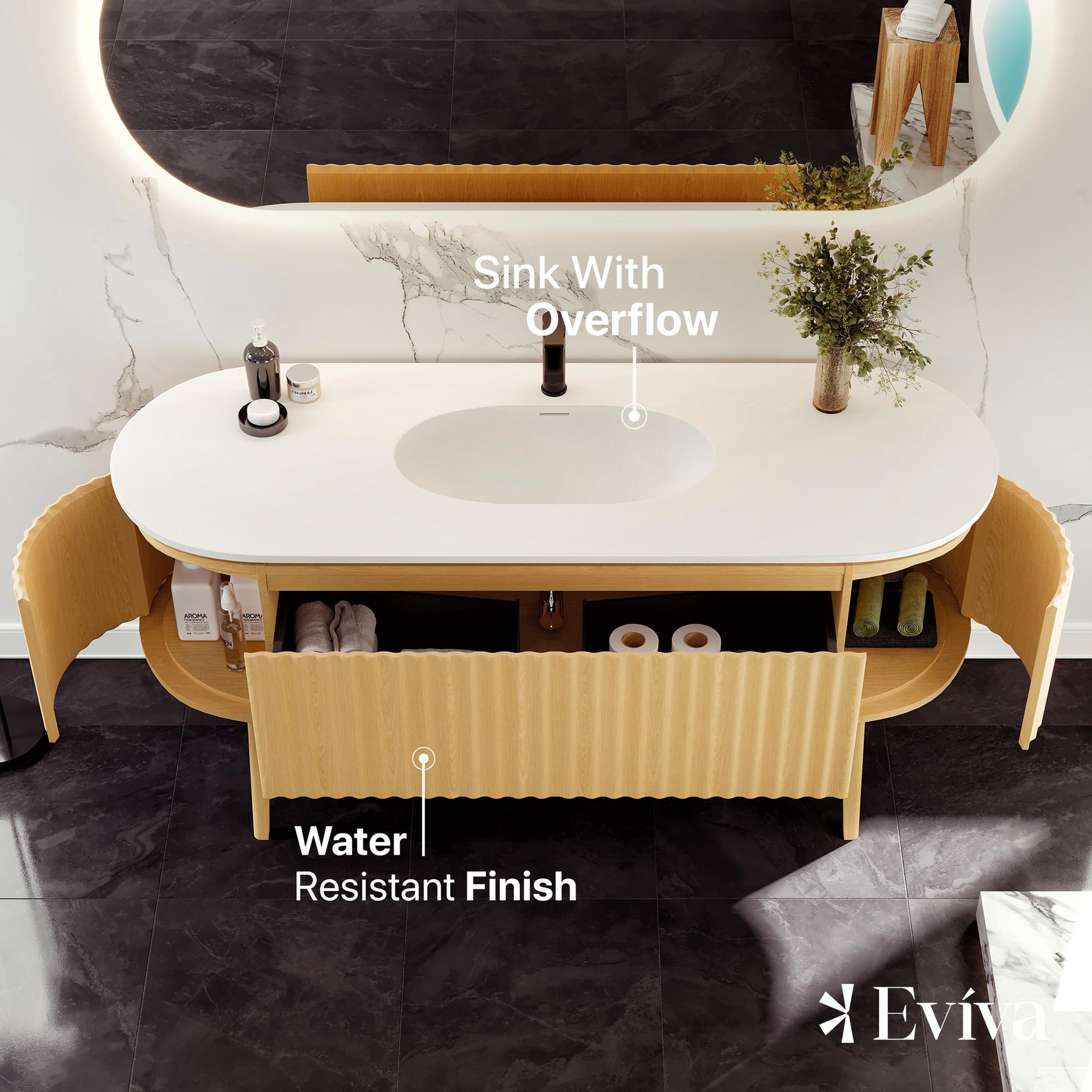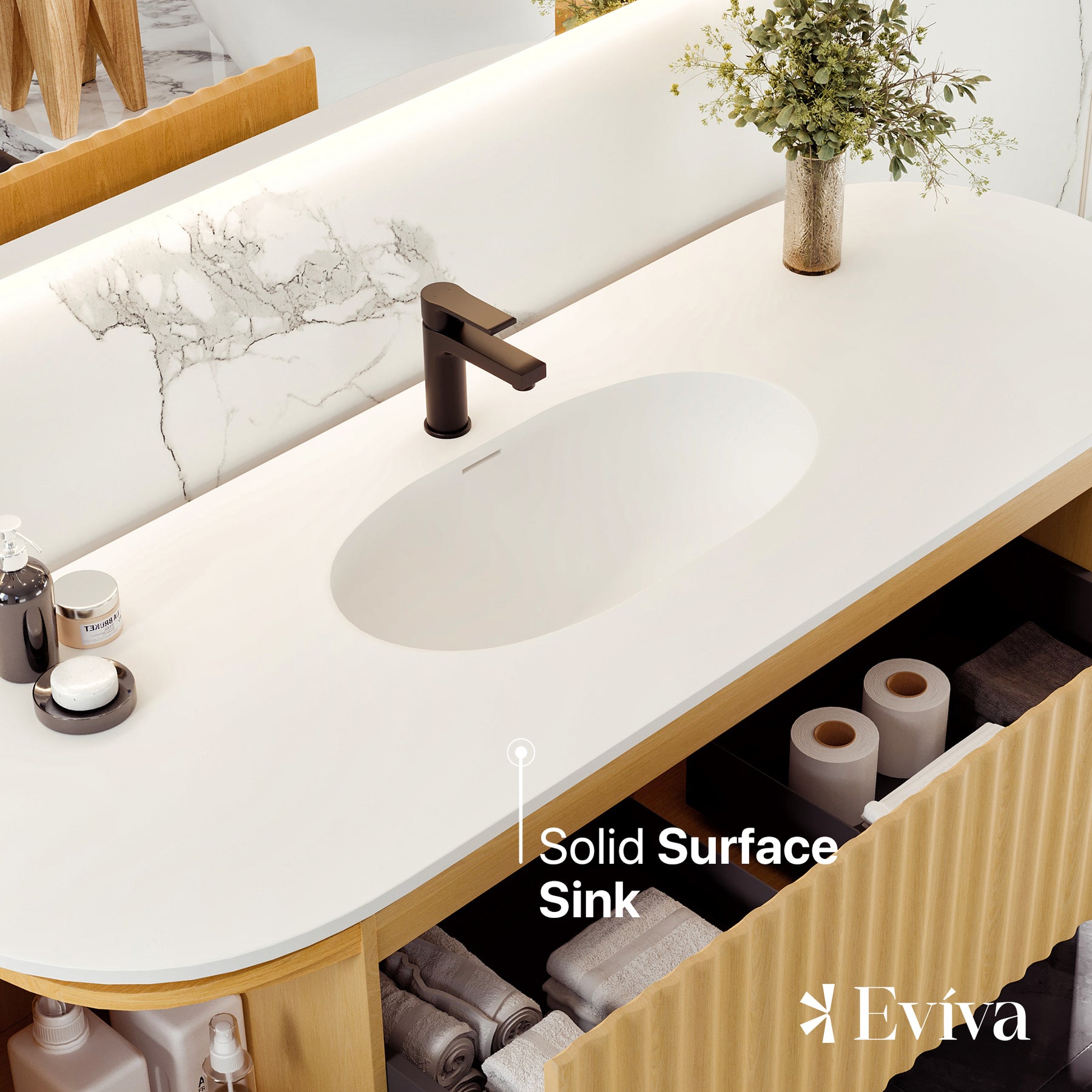 The Eviva Haven Natural Oak freestanding bathroom vanity exudes modern elegance with its seamless design and rounded edges. The front features a striking fluted pattern, showcasing vertical grooves that add texture and contrast with the rounded edges. The Haven is crafted with real wood and finished with a solid natural Oak wood veneer, giving the cabinet a textured, natural look. Topped with a pristine solid surface countertop with an integrated sink, the Haven’s top resists stains and is maintenance-free. The Haven features unique side-hinged outward opening soft closing doors and a fully extending soft closing drawer. The cabinet arrives fully assembled, allowing for an easy installation.