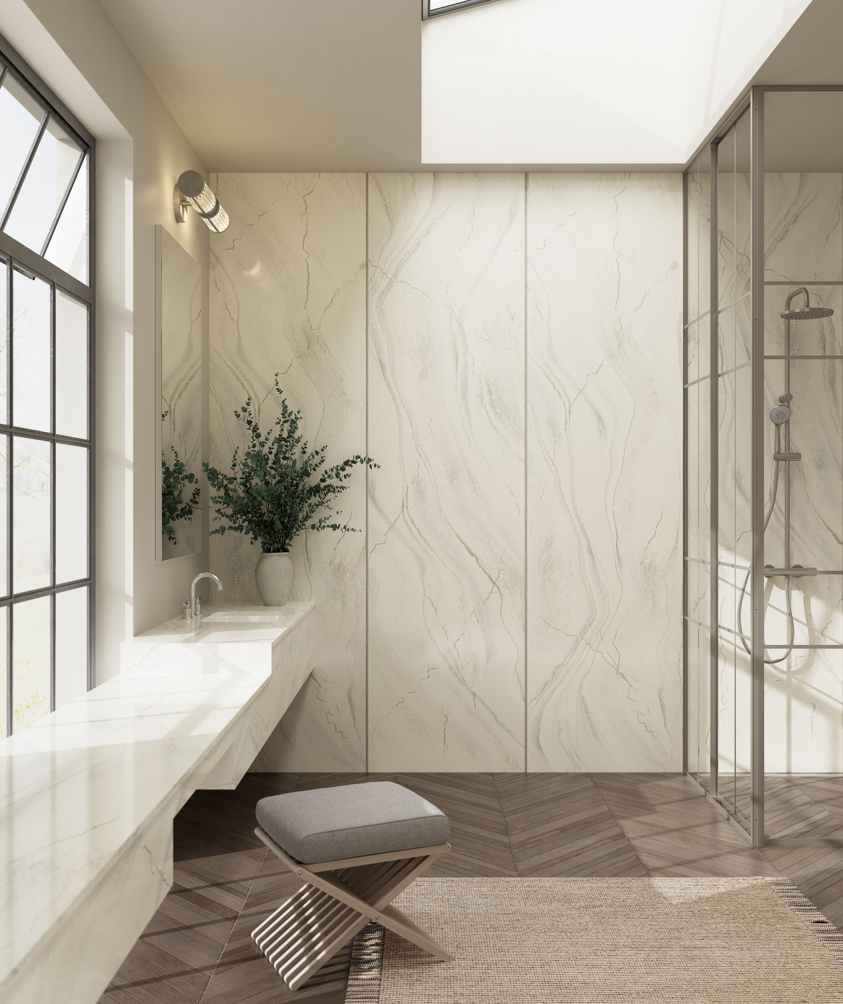 Statement meets subtle in this movement-rich design that features cool gray and warm, sand-honey tonalities, combining the best of bold patterns and soft, tone-on-tone design with delicate debossed Inverness™ veins.