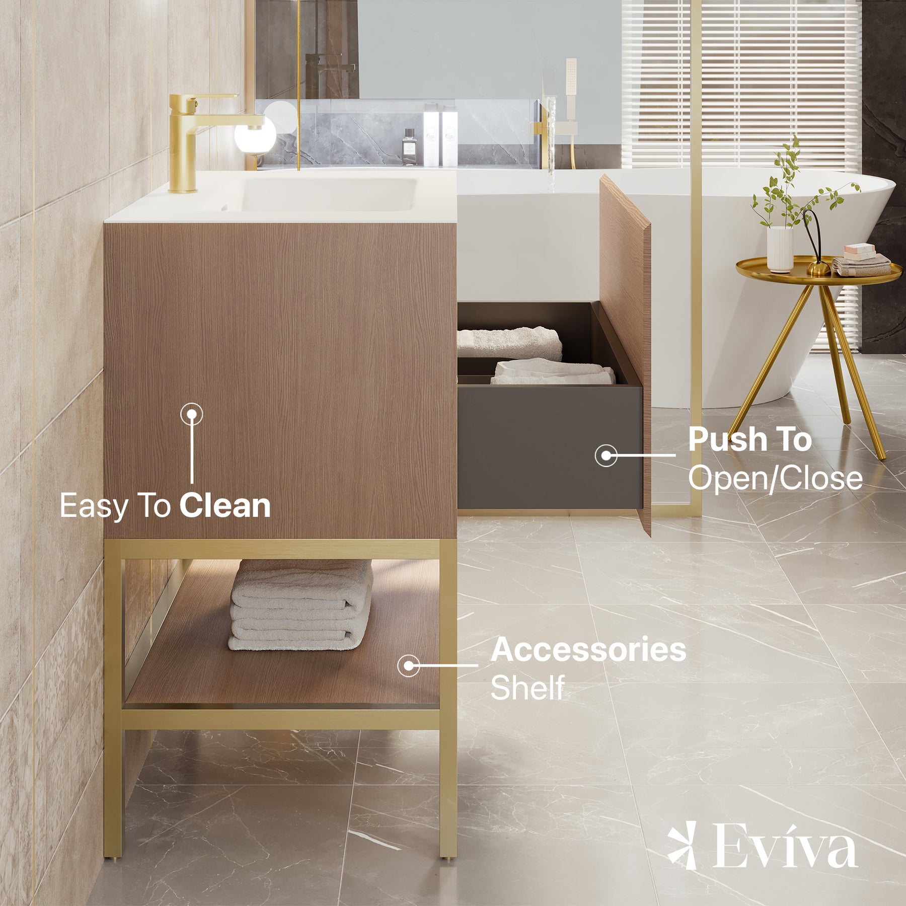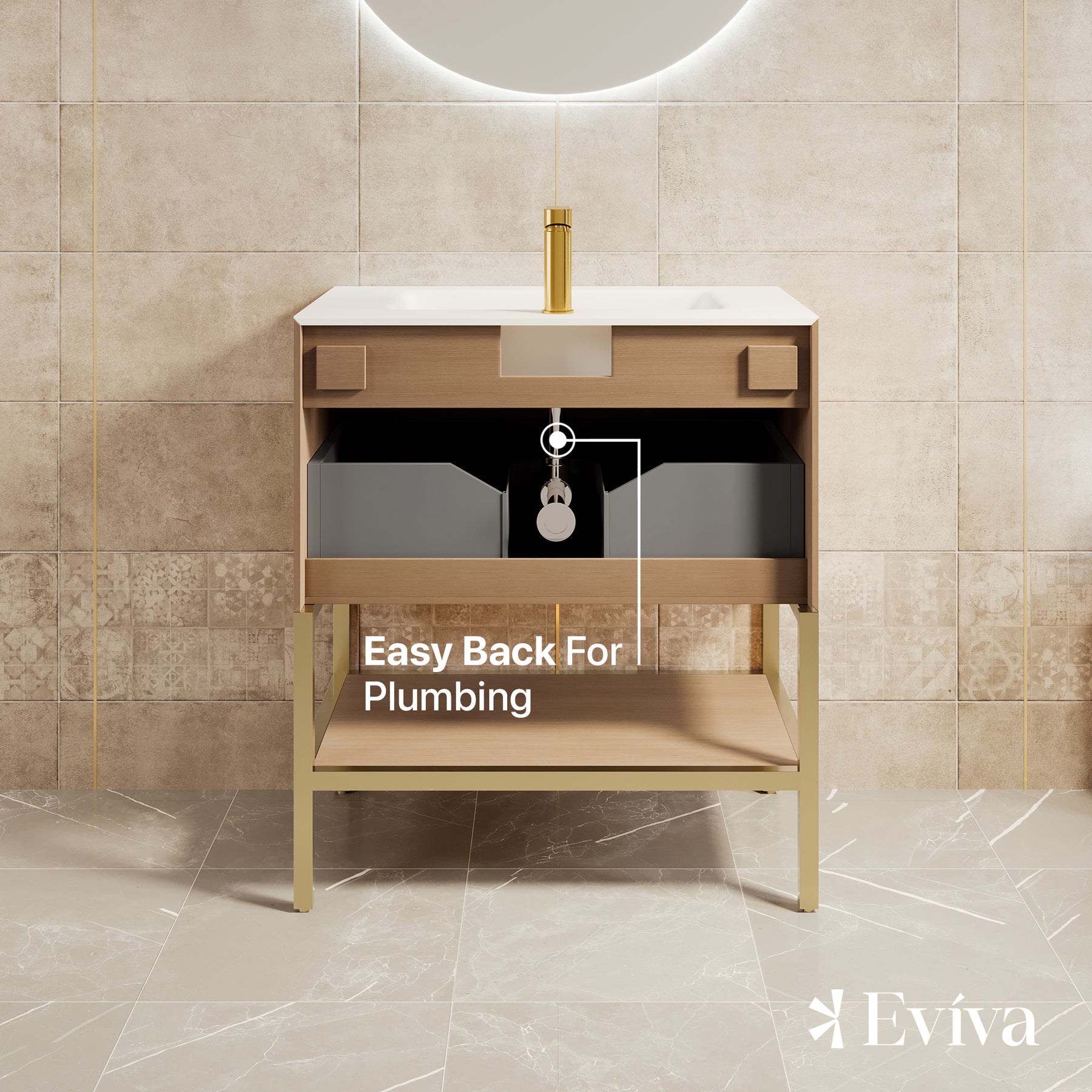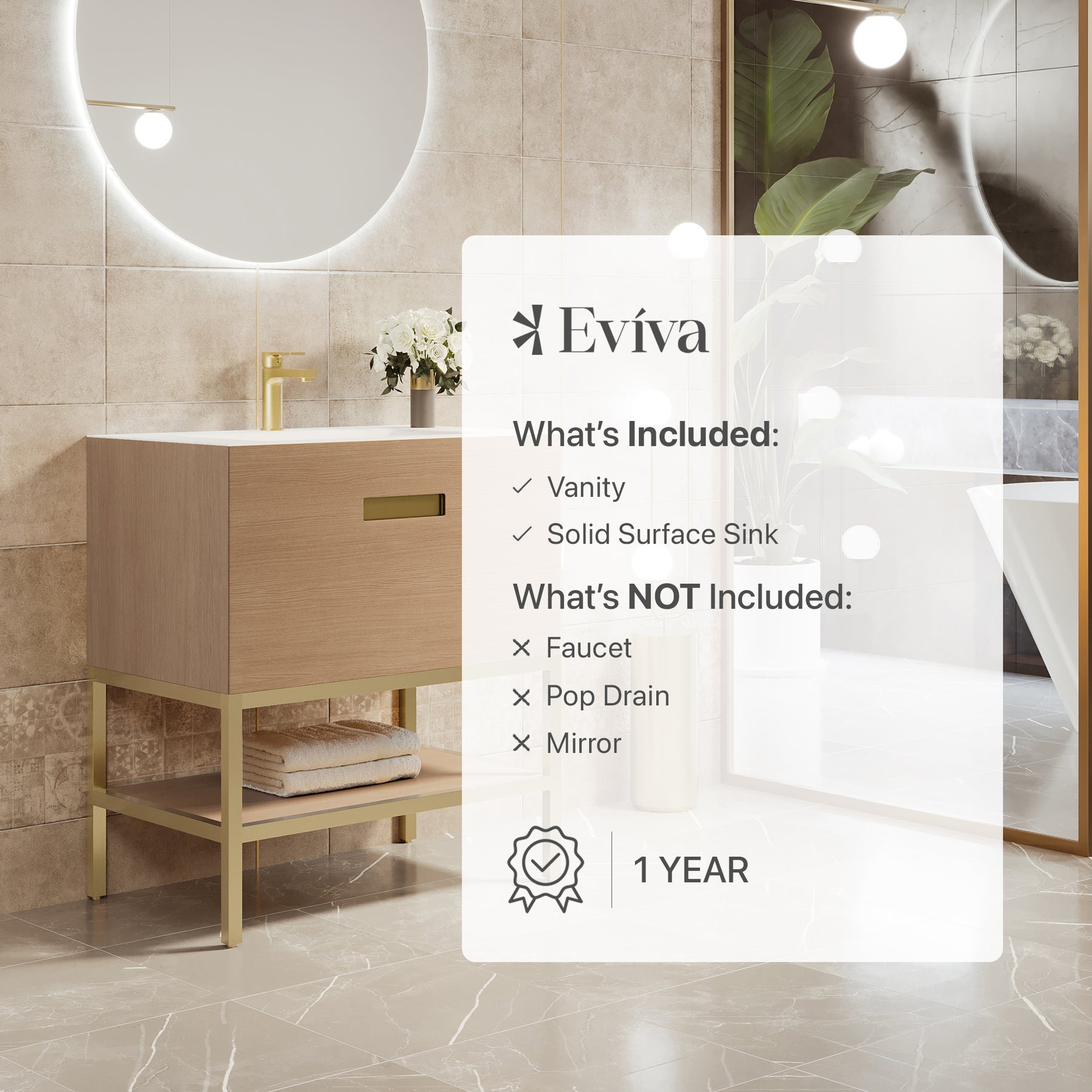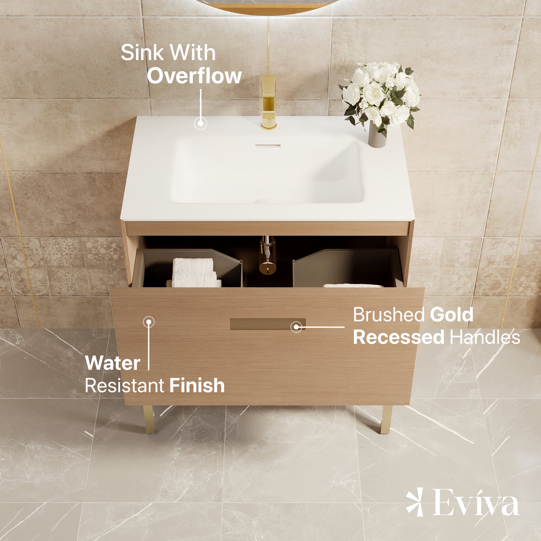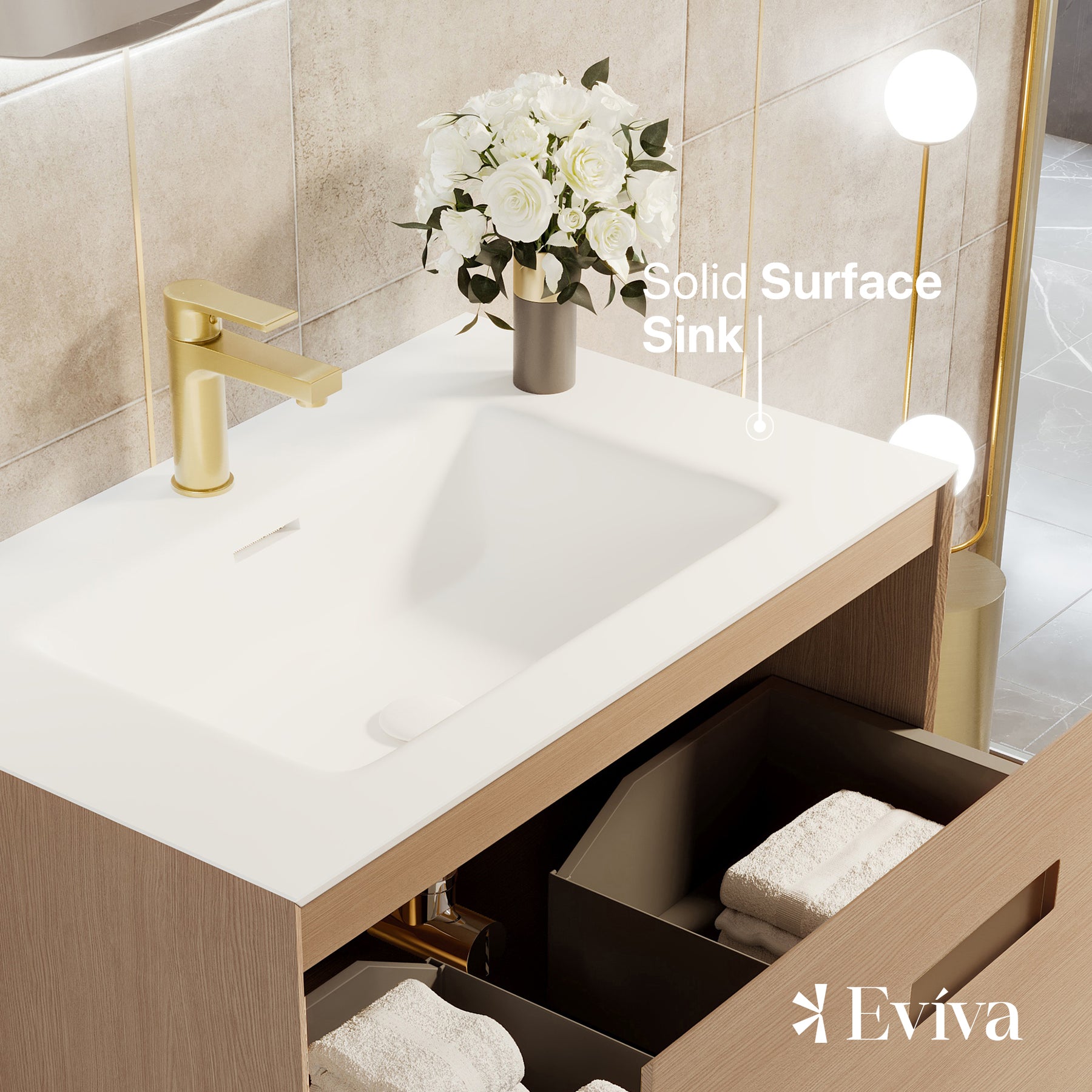 Iris Natural Oak Bathroom Vanity with White Solid Surface Countertop and Integrated Sink.