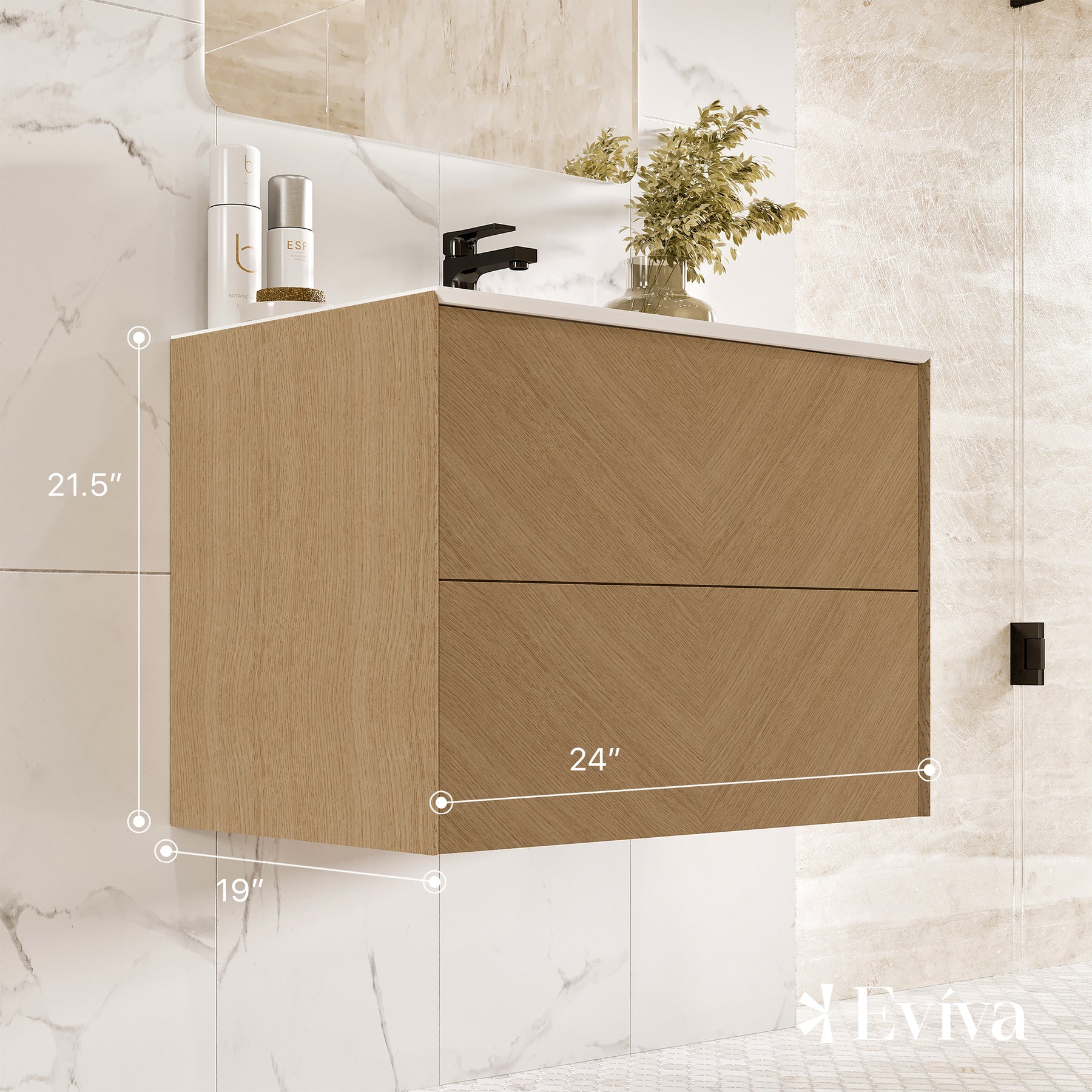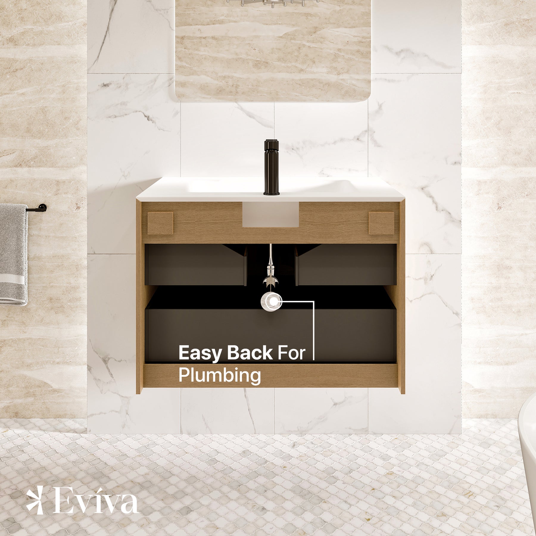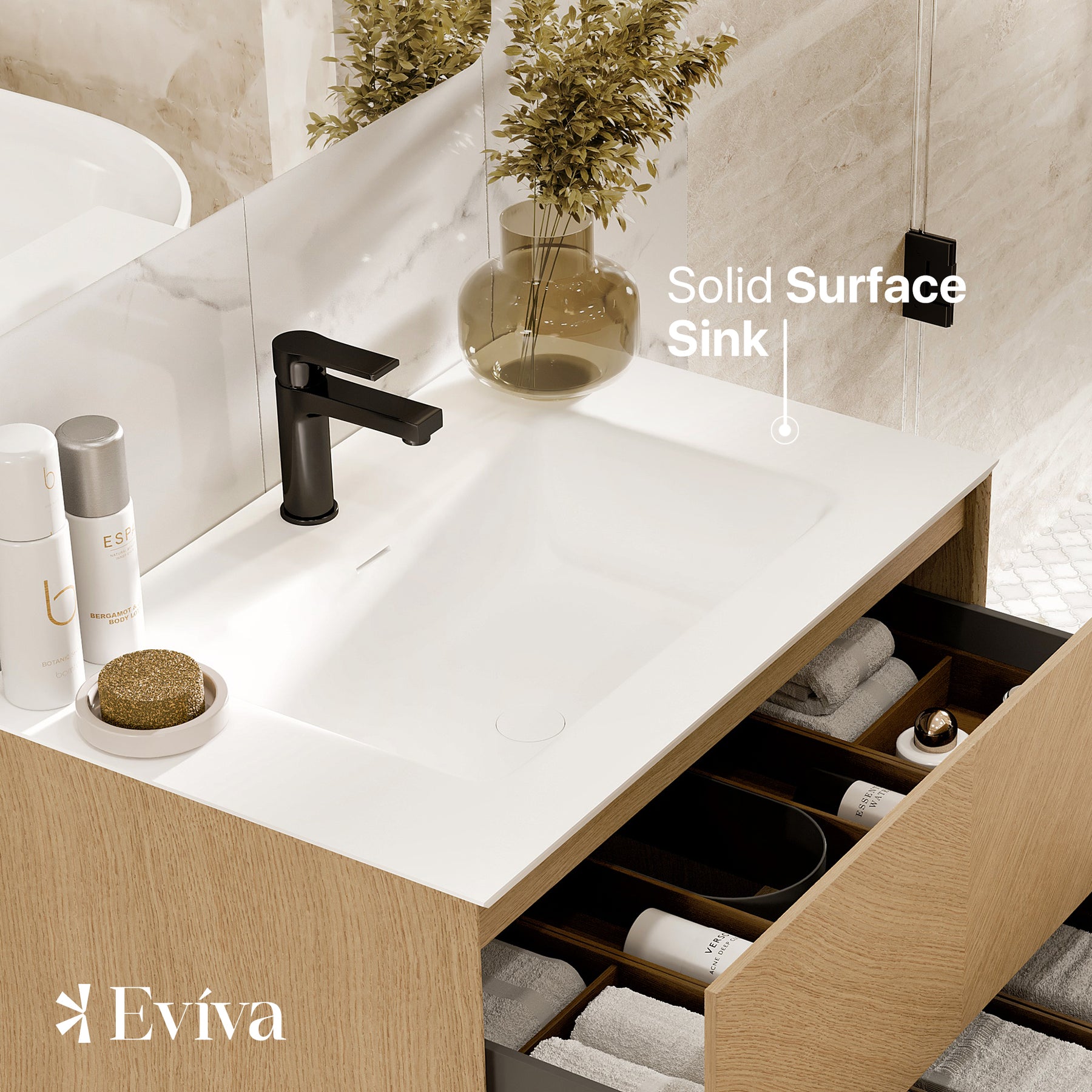 Lotus Natural Oak Wall Mount Bathroom Vanity with White Solid Surface Countertop and Integrated Sink.