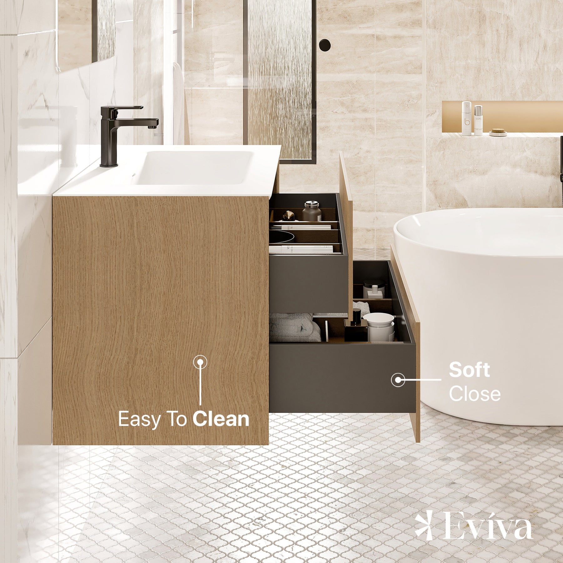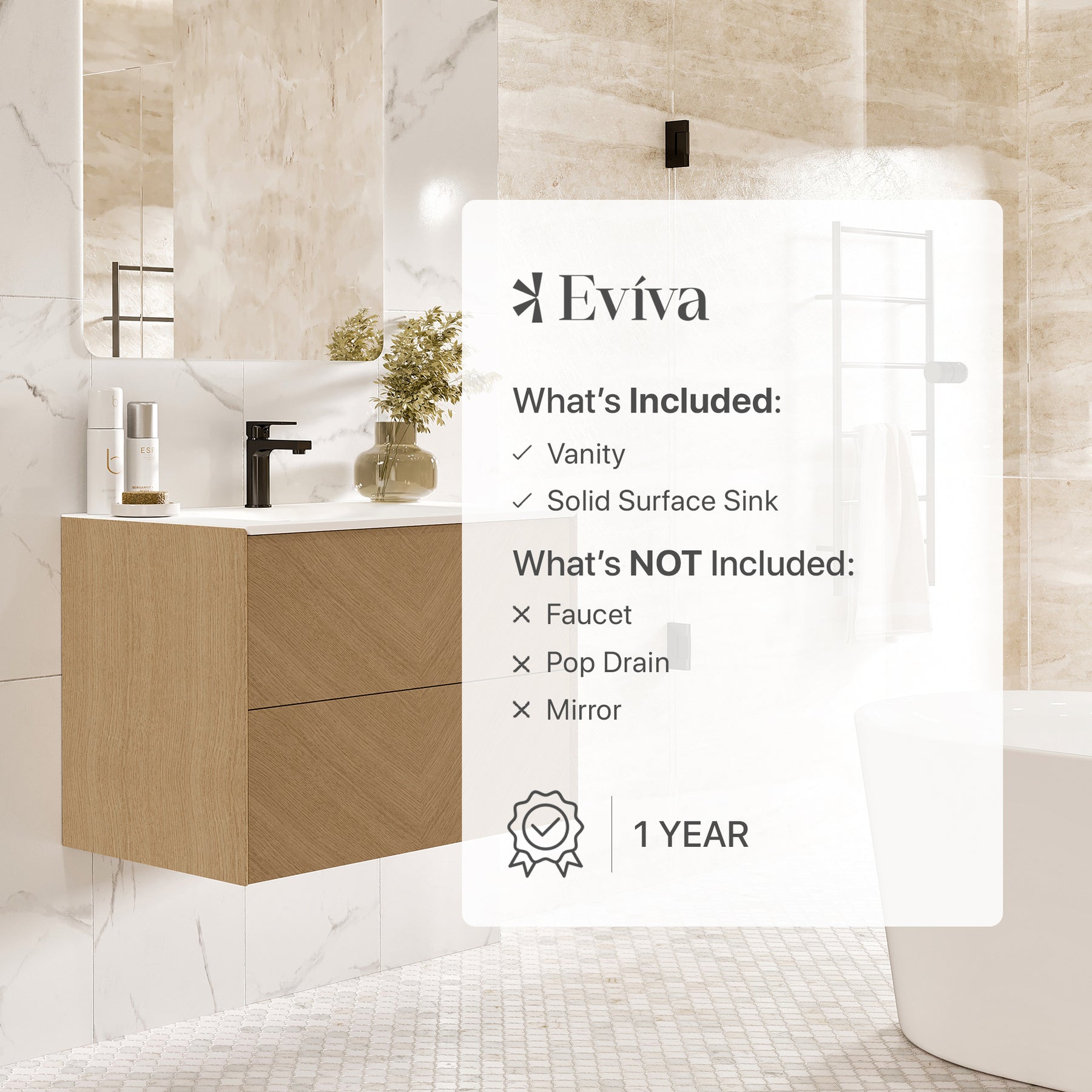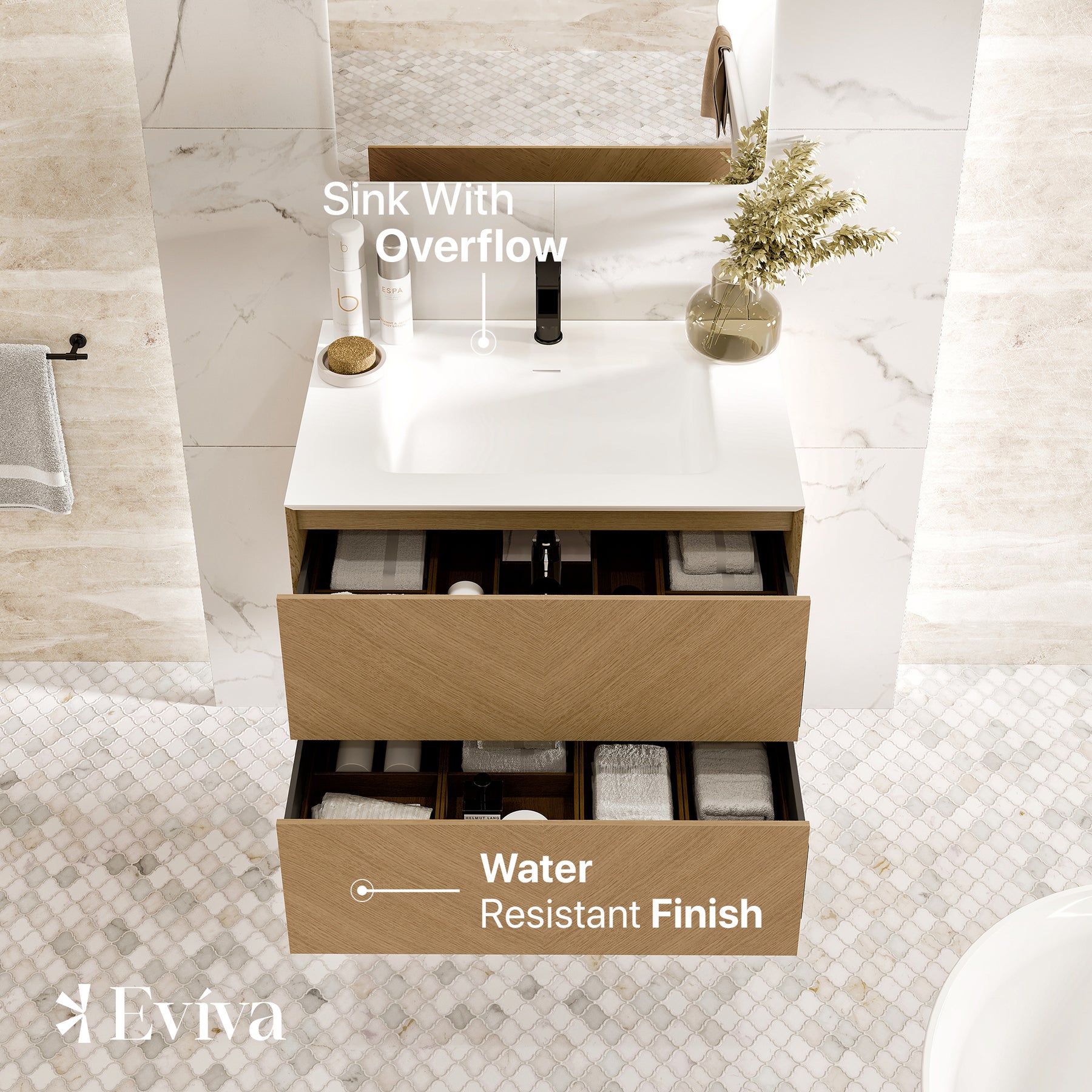 Lotus Natural Oak Wall Mount Bathroom Vanity with White Solid Surface Countertop and Integrated Sink.