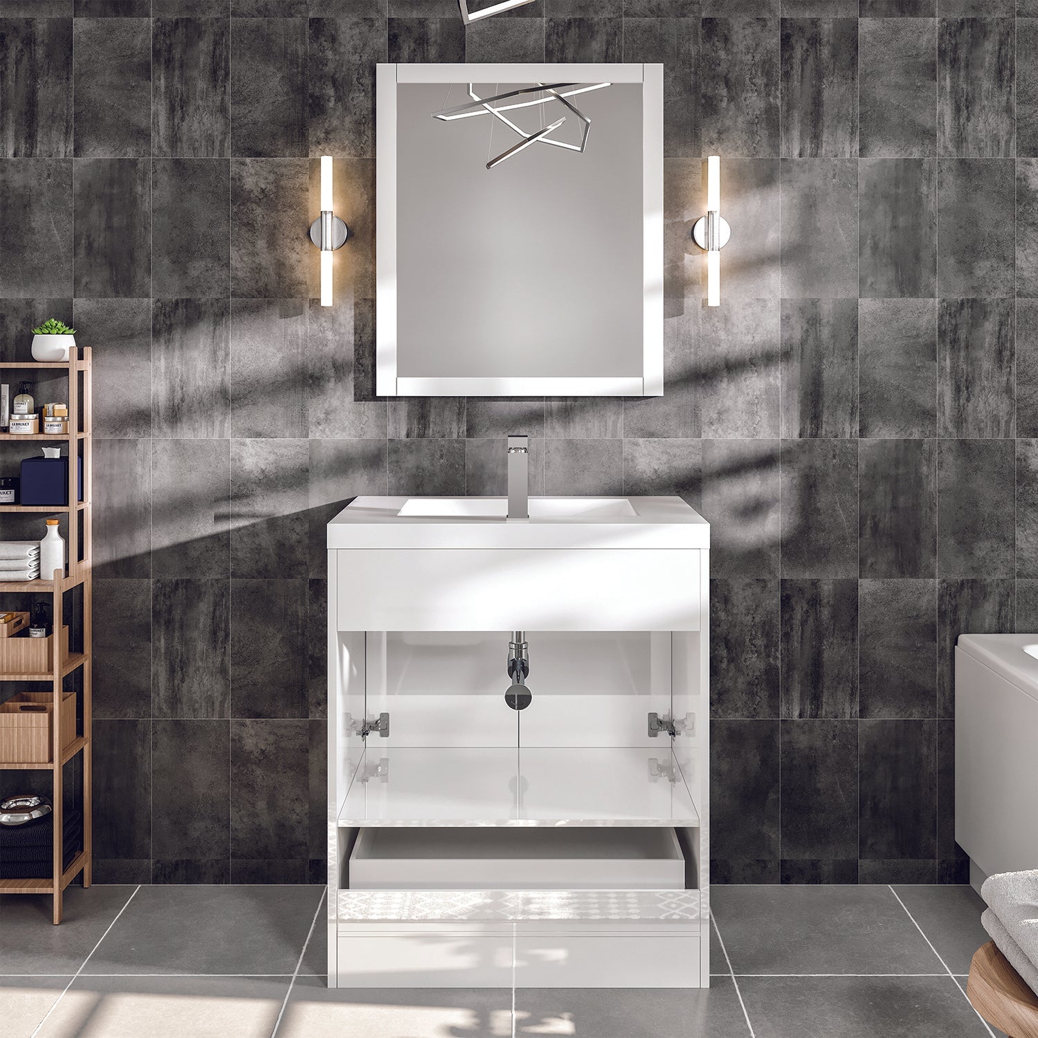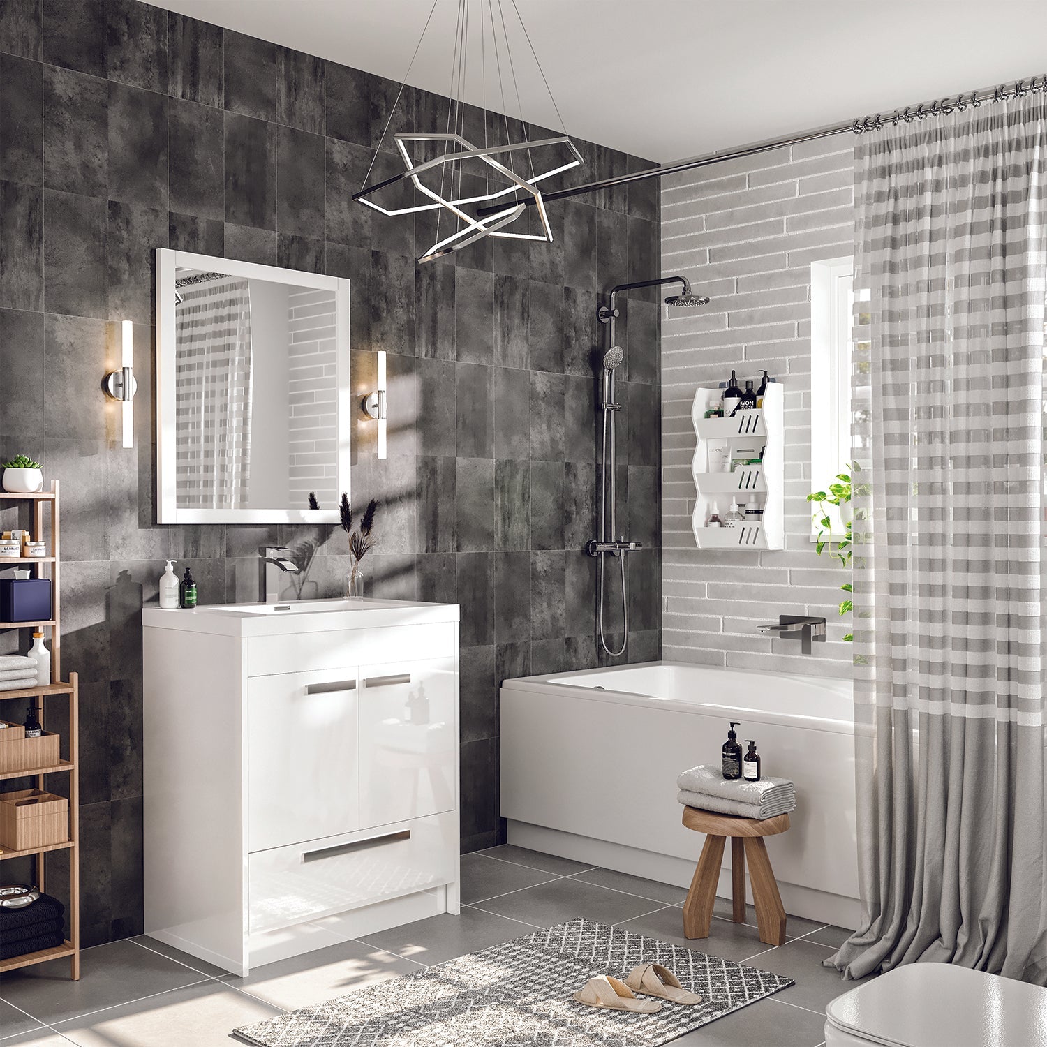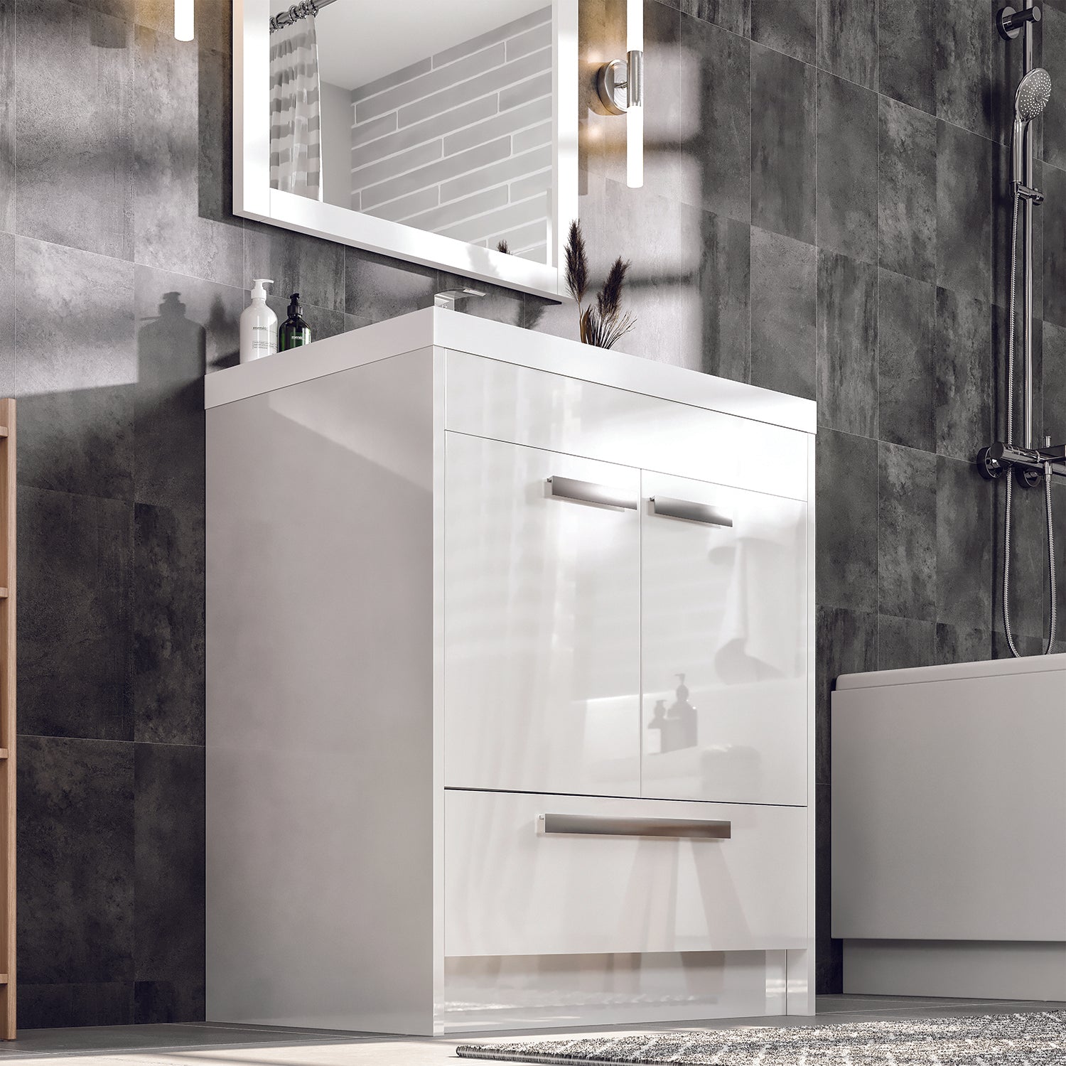 The Eviva Lugano White bathroom vanity, our most popular modern line, epitomizes modern vanity design. The Lugano is constructed of high-grade wood engineered for maximum durability and longevity, finished with multiple coats of high-quality paint for a smooth & glossy white finish, and a stain-resistant & maintenance-free acrylic countertop with an integrated sink and single-hole faucet mount. The Lugano offers impressive storage space in a compact-sized vanity with a soft-closing drawer and 2 soft-closing doors with spacious shelves. The Lugano is available in widths of 24″, 30″, 36″, 42″, 48″, 60″, 72″, and 84″ with a 22″ depth in beautiful finish options of White, Gray, Rosewood, Natural Oak, Gray Oak, and Concrete Gray with both single and double sink options.