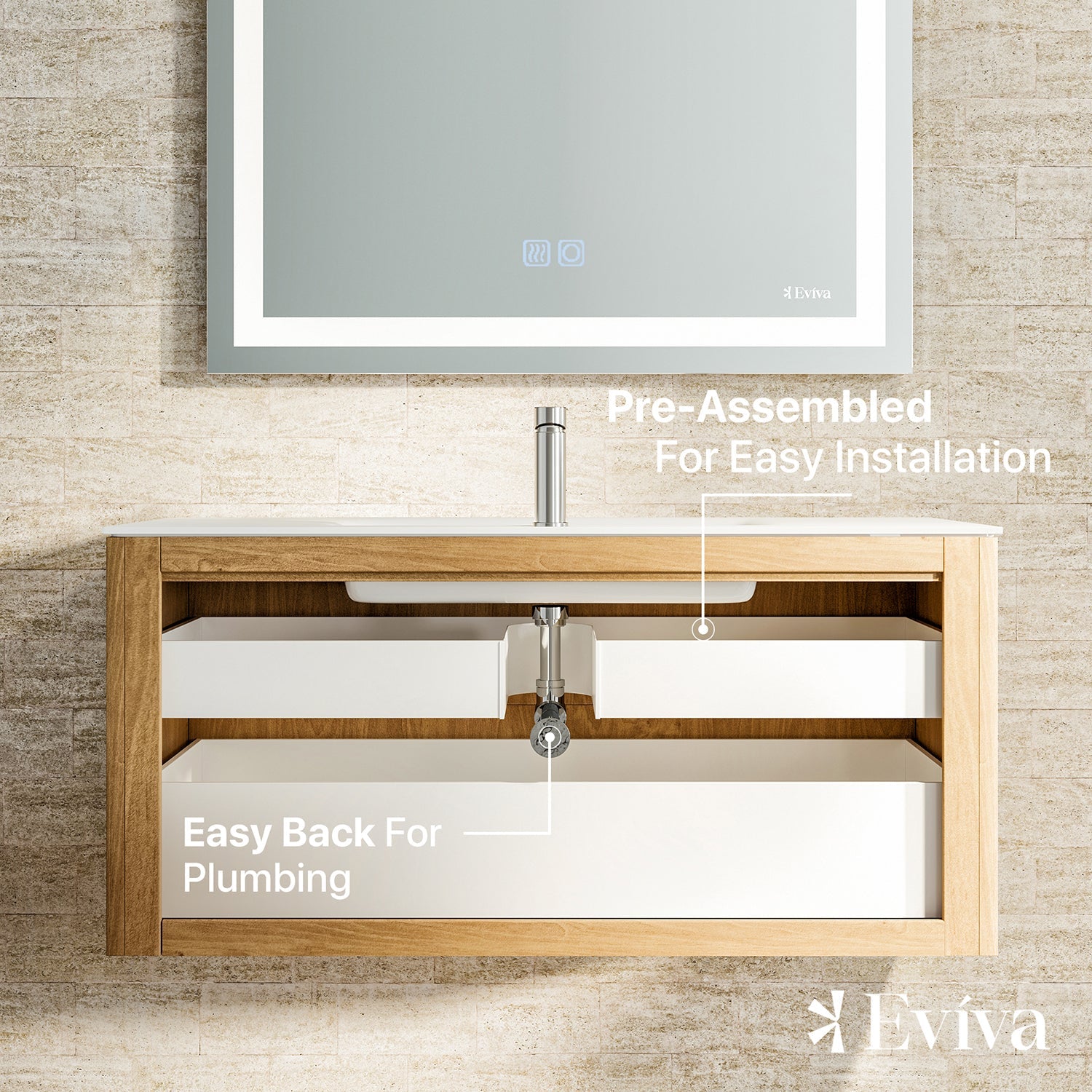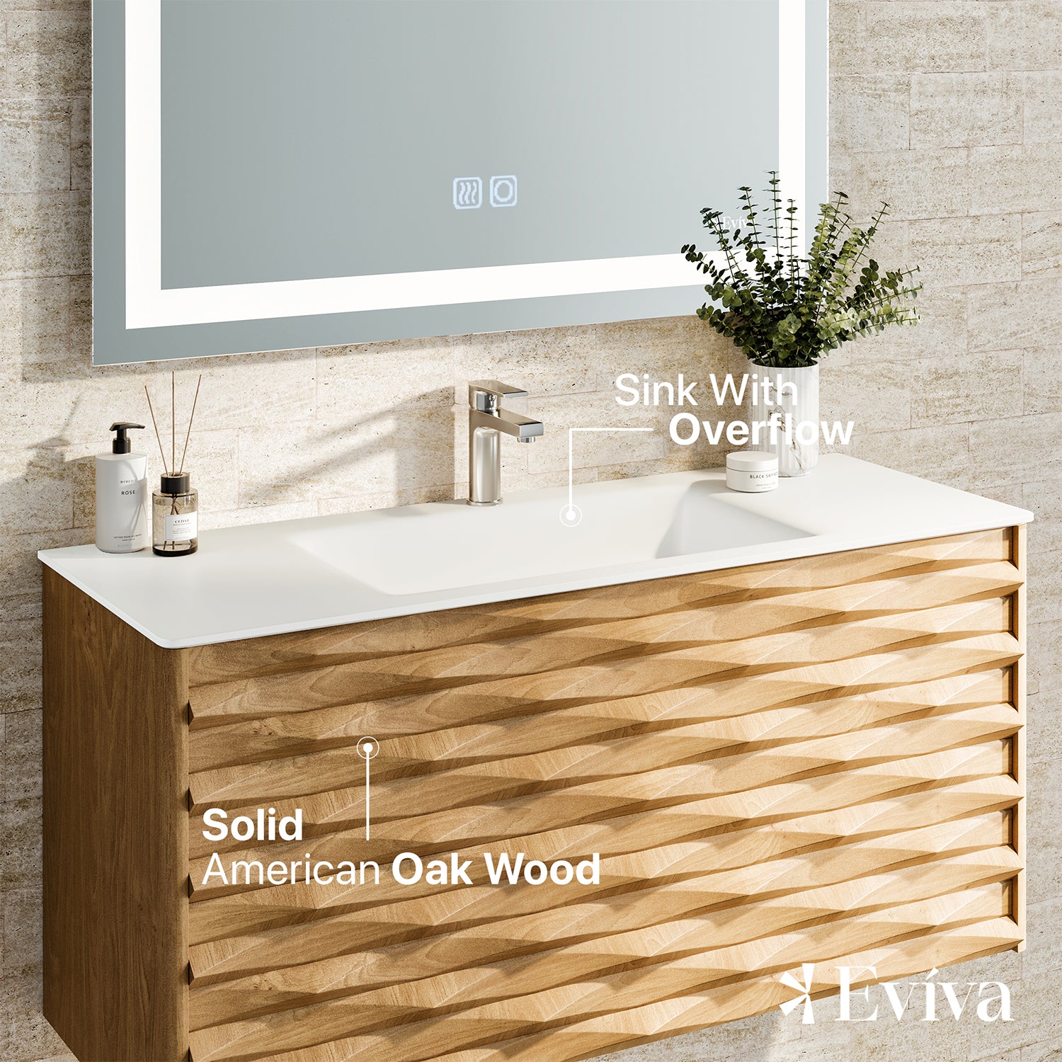 Designed and manufactured in Spain, the Oahu wall-mounted bathroom vanity is part of the high-end Eviva ELITE collection. The Oahu is constructed of full Solid American Oak wood, and the wave-like, three-dimensional design adds a unique and dynamic texture, while the natural wood finish brings warmth and organic beauty to any bathroom. Its luxurious, smooth, stain-resistant & maintenance-free Solid Surface countertop with a pre-drilled single-hole faucet mount adds to the Oahu’s elegant feel. Its two drawers are deep which provide ample storage space and are fully extending and soft-closing. The cabinet arrives fully assembled and ready for installation. The Oahu is available in widths of 32″, 44″, and 55″ with a 20″ depth, with both single-hole and wall-mounted faucet options.