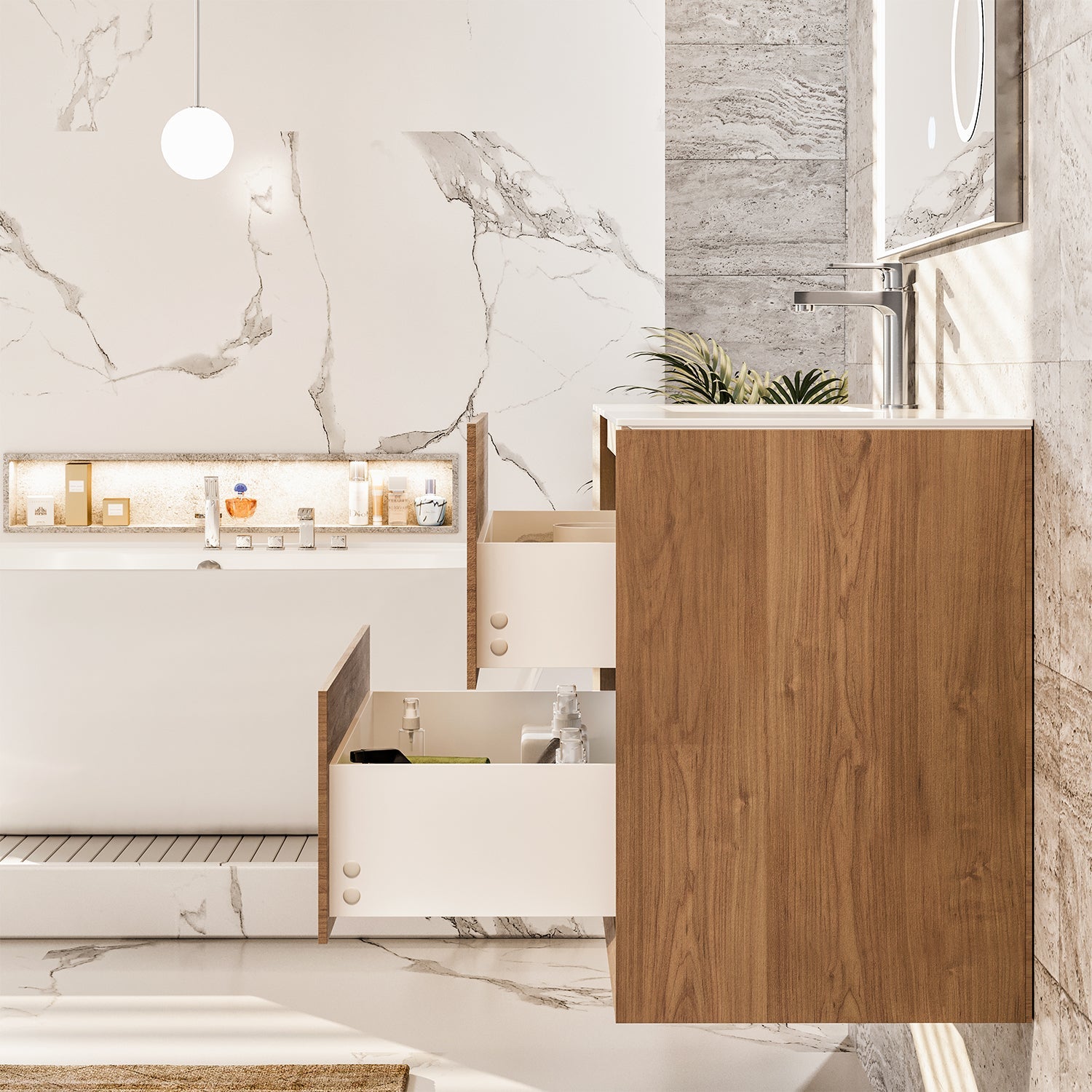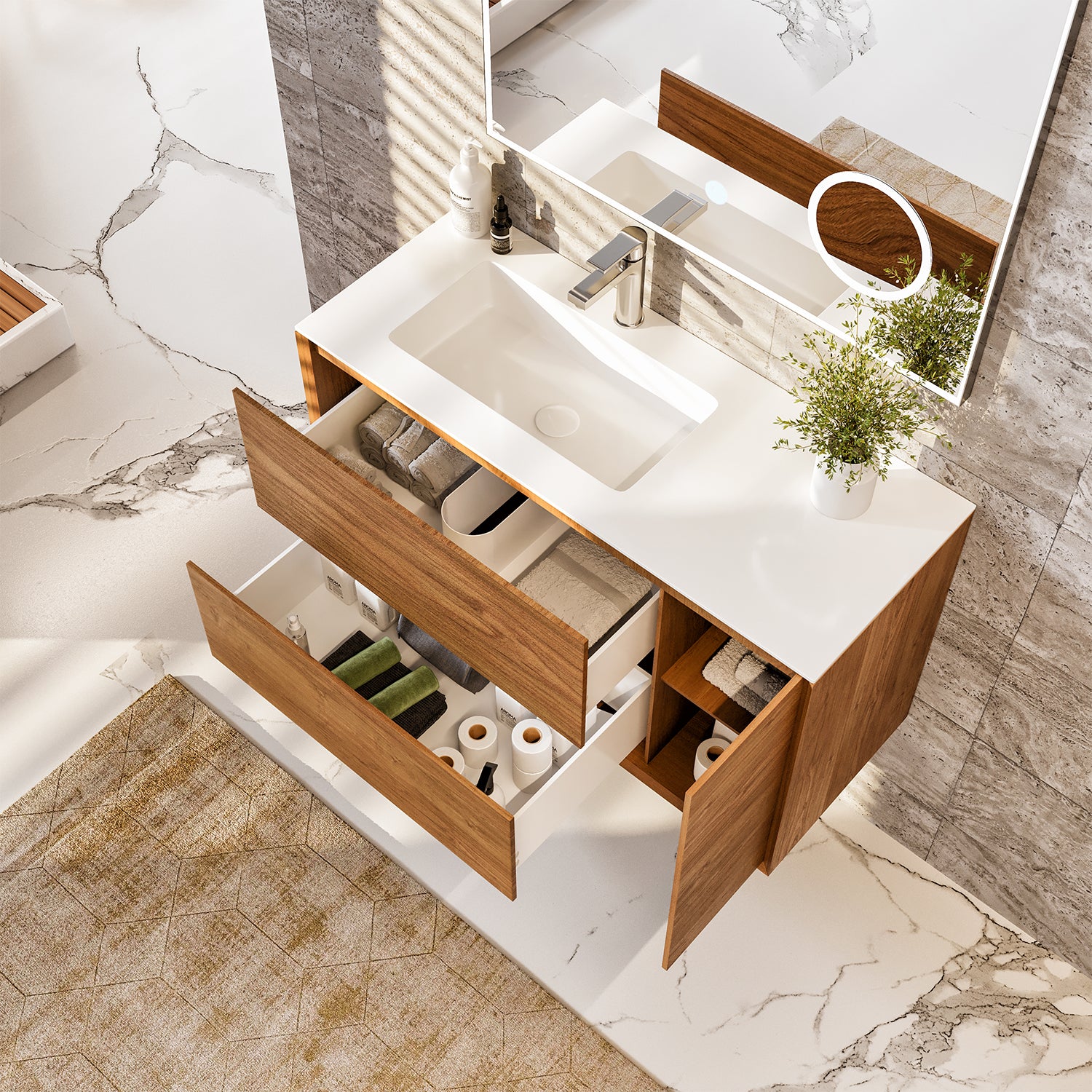 Designed and manufactured in Spain, the Prancer is part of the high-end Eviva ELITE collection. The Prancer makes a bold statement with its beautiful full solid American Oak wood cabinet which has a beautiful natural textured finish. It features a smooth and luxurious stain-resistant and maintenance-free solid surface countertop with an integrated sink and pre-drilled single-hole faucet mount. Its drawer is soft-closing and fully extending, and features a 45-degree integrated drawer handle, allowing for a smooth operation and ample space to store your essentials. The cabinet arrives fully assembled and ready for installation. The Prancer is available in widths of 36″ and 44″.