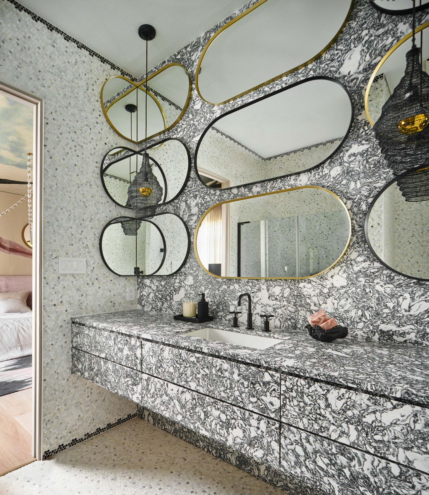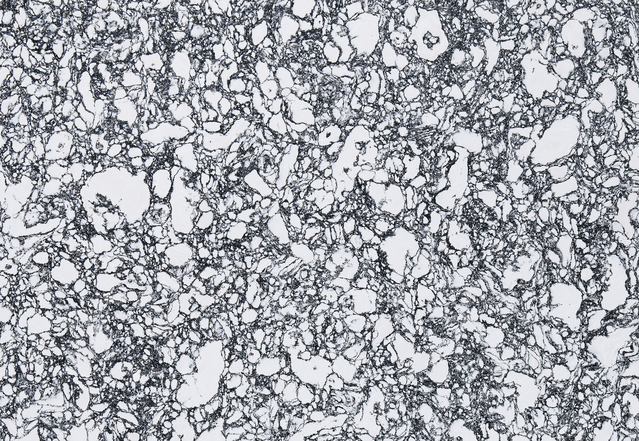 A white foundation is infused with robust black marble veining, creating a striking abstract effect where opposites definitely attract.