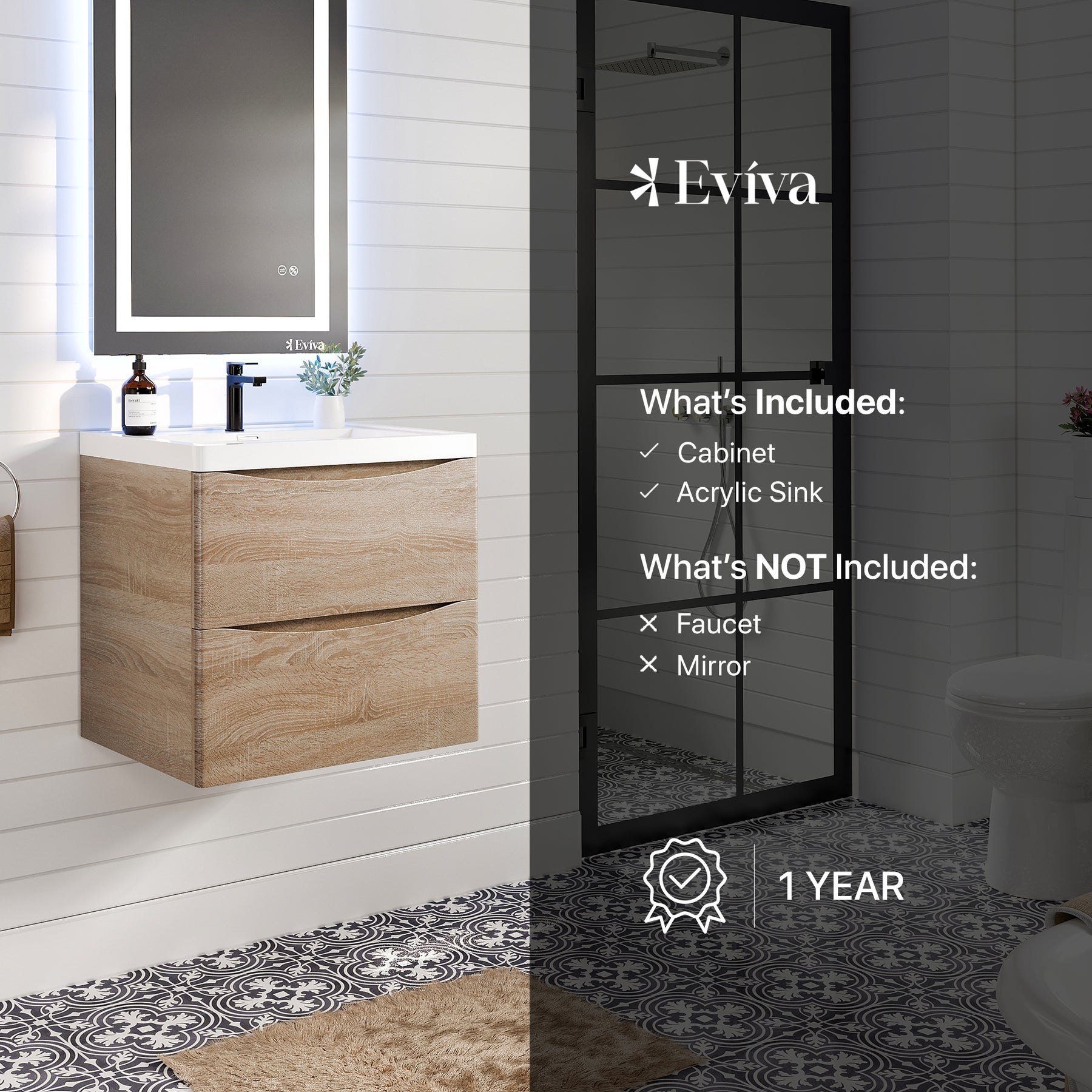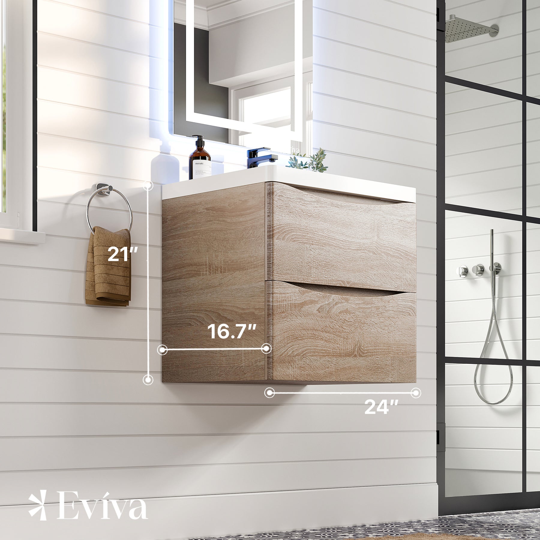 The Eviva Smile bathroom vanity is the perfect modern vanity to brighten up your bathroom. Featuring a modern stain-resistant & maintenance-free acrylic countertop with an integrated sink, a sleek & unique 2-drawer design which are soft-closing, and provides ample storage capacity to store all of your bathroom needs comfortably. The cabinet is adorned with a beautiful textured White Oak finish, adding to the Smile’s sleek yet luxurious feel. The cabinet arrives fully assembled for a quick and easy installation. The Smile is available in widths of 24″, 28″, 30″, 36″, and 48″ in beautiful textured finishes of Chestnut, White Oak, and Rosewood with both wall mount and freestanding, as well as single and double sink options.