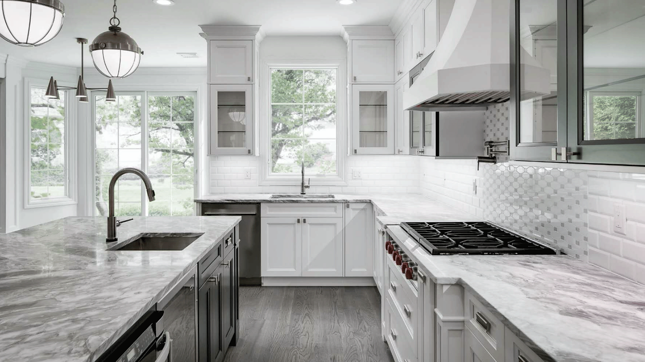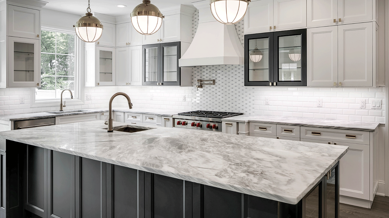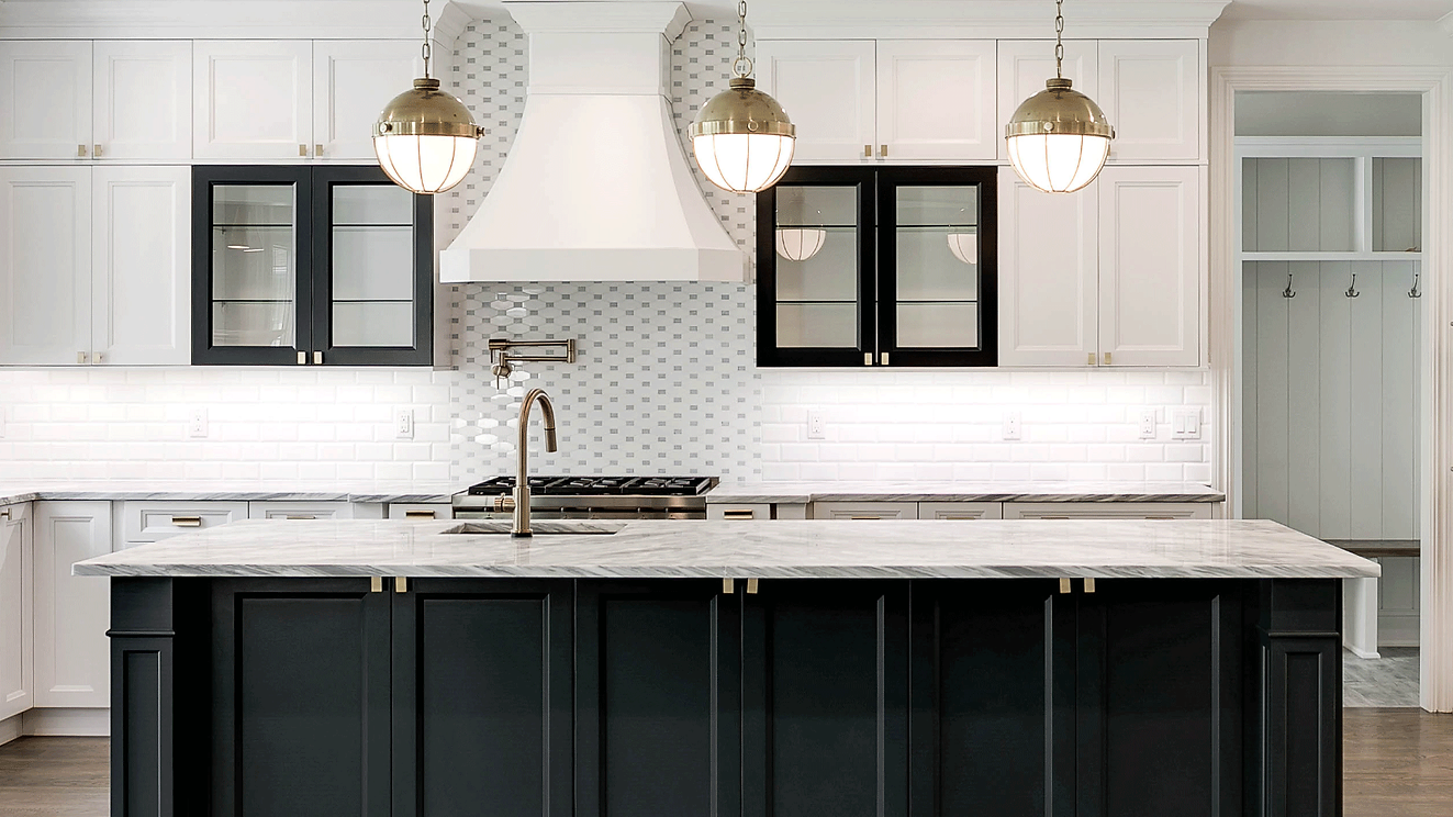This free-spirited two-tone kitchen features a Bright White perimeter and Midnight Blue island. A painted St. Martin Cabinetry New Orleans hood is the centerpiece of the room and is flanked by Midnight Blue wall cabinets which add interest and drama. Also incorporated are stacked cabinets for additional storage and brass hardware and lighting elements which complement the other colors masterfully.