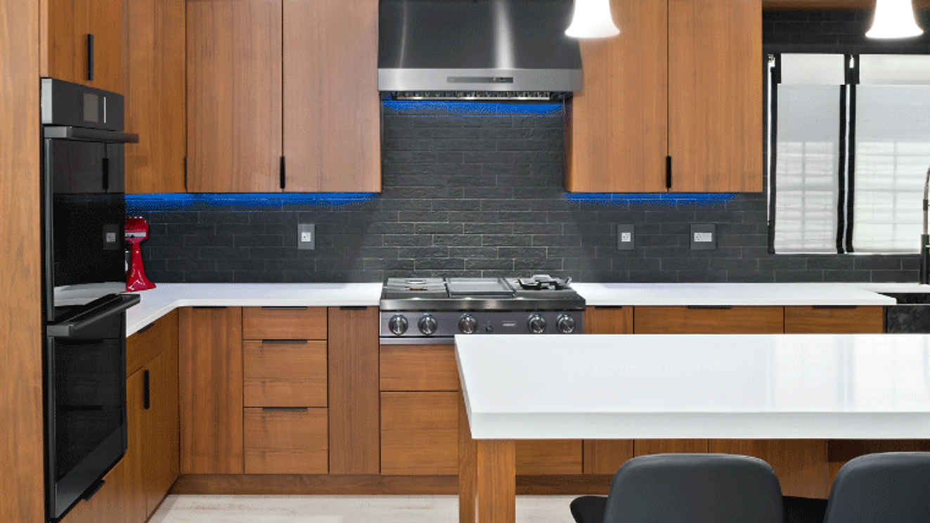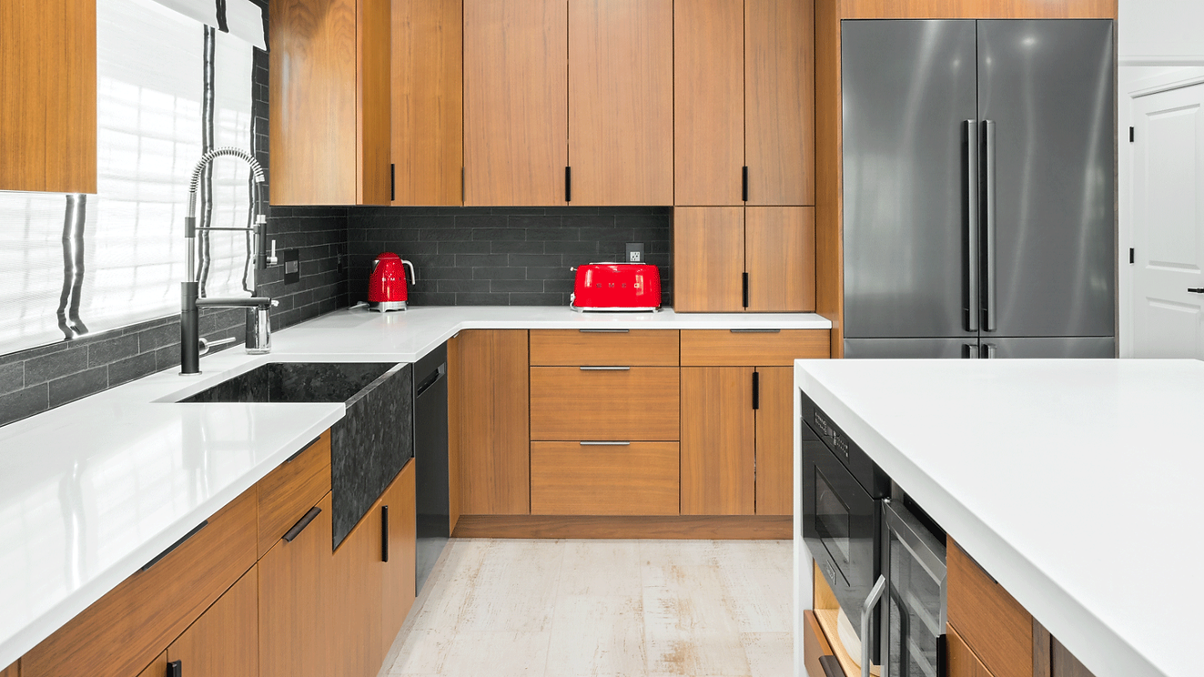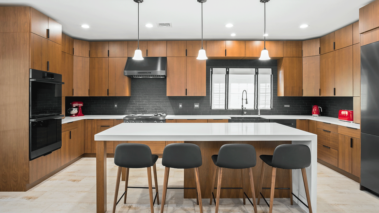 This Mid-century modern marcel showcases our contemporary Clayton door style in natural walnut wood veneer. The walnut is grain matched to give runs of cabinetry uniformity and warmth. Splayed leg furniture, dark stainless appliances and the custom island complete this masterpiece.