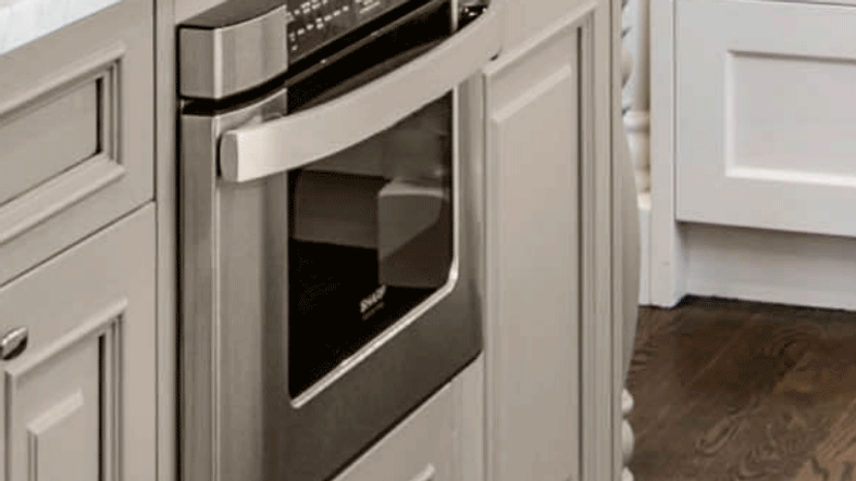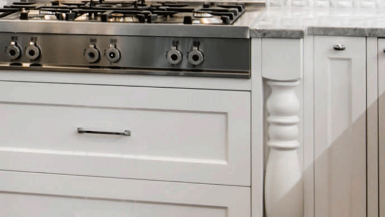 This classic, All-American kitchen features timeless accents that have been popular since our nations inception. Mullion glass doors match the exterior doors and windows throughout the home and the dark oak floor provides a lovely contrast to the Bright White and Gray Stone cabinetry. Modern flourishes were also included such as the built-in microwave drawer in the island and the stainless hood above the cook-top.