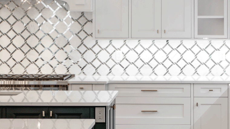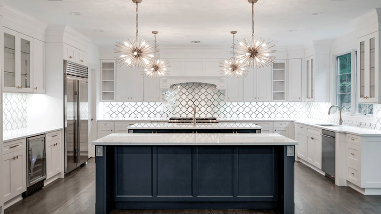 Blue is a fun color that evokes images of fresh water and clear sunny sky’s. When added as an accent in the kitchen, imaginations wander and creativity flows. This stunning Bright White kitchen features two Oceania Blue islands that not only look great, but afford extra space for socializing and food preparation.