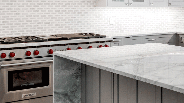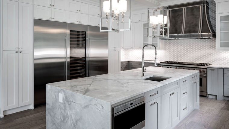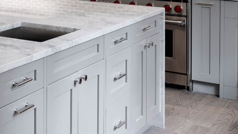 The utilization of a second color in the kitchen is no longer being limited to just the island. The designer of this avant-garde space decided to add intrigue by using Simply Gray cabinets for the island and for the base cabinets below the the large metallic range hood. Tall cabinets were also used on each side of the stainless refrigerators and wine cooler to give balance and symmetry to the space.