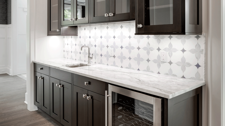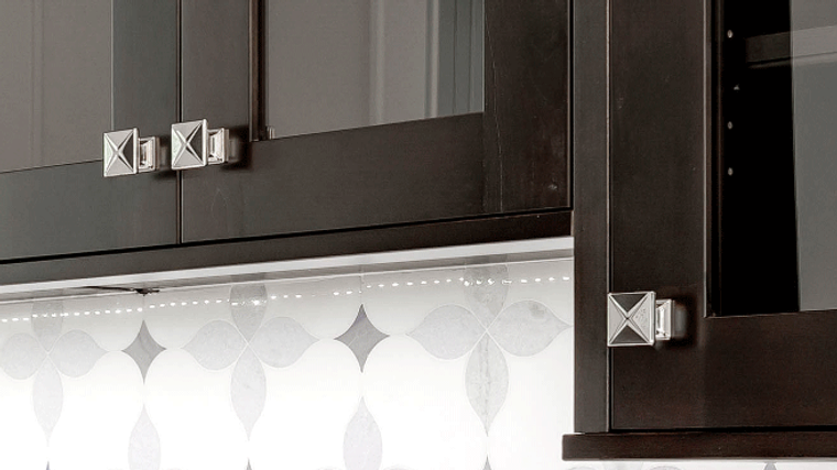 Sometimes less is more and this minimalist space proves it. The dark cherry Gunsmoke cabinets blend in seamlessly with the dark wood floors which results in a neat, fluid and relaxing environment.