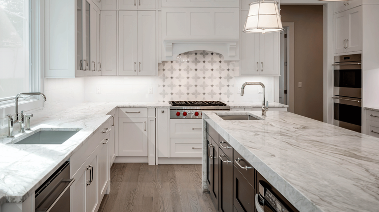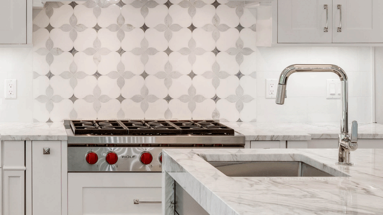 This gorgeous two-tone kitchen features Simply White for the perimeter and Cherry Gunsmoke for the island. This alluring contrast is accentuated by polished chrome accents, stainless appliances and a unique mosaic back-splash.