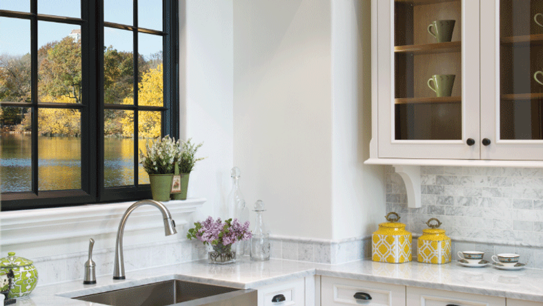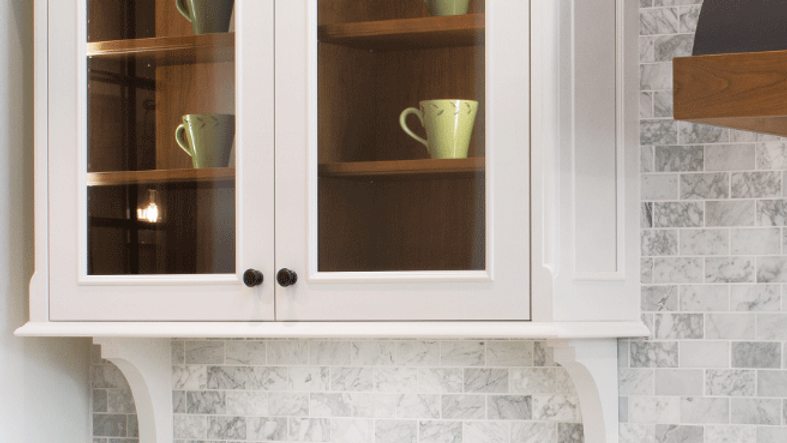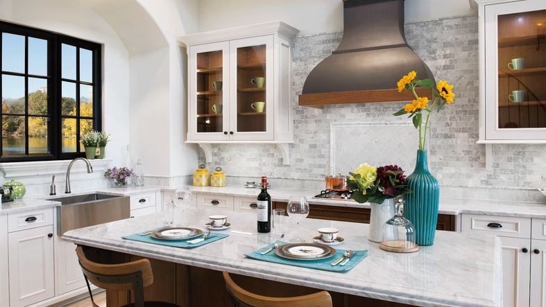 This lakeside Simply White and Cherry Cognac kitchen is bright, open and airy. The space features a St. Martin Chateau wall hood, which is a statement piece that matches the glass wall cabinet interiors and island. The designer also opted to float the wall cabinets below the Chateau hood and ceiling to add scale and drama. Subtle blues and yellows were included in the interior furnishings to accentuate the water views and add to the nautical vibes.