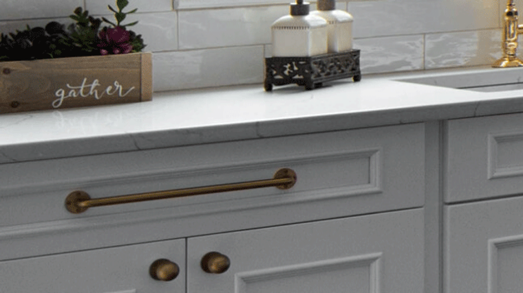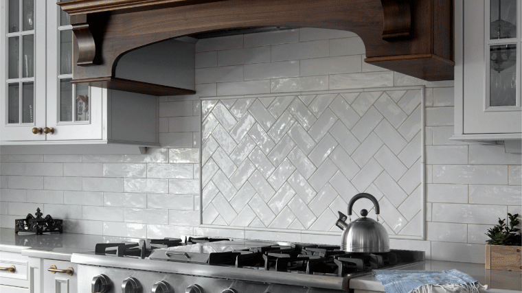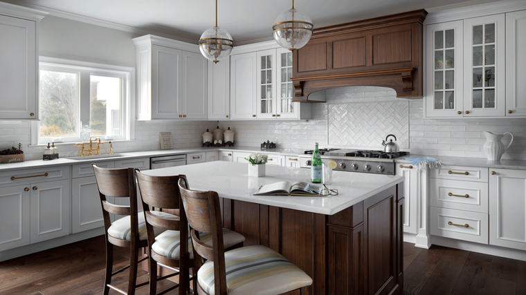 This colonial style Ridgewood Bright White kitchen is timeless and elegant. The wood hood and island are finished on Natural Walnut wood species, which is known for its unique patina, color pattern and exotic wood grain. When combines with white, the brilliance and artistry of the walnut is released. This kitchen also features traditional mullion style glass doors in addition to extra large drawers below the stainless cool top.