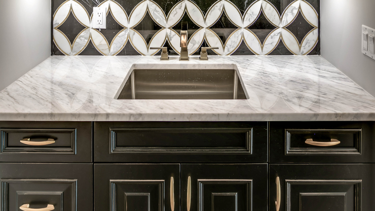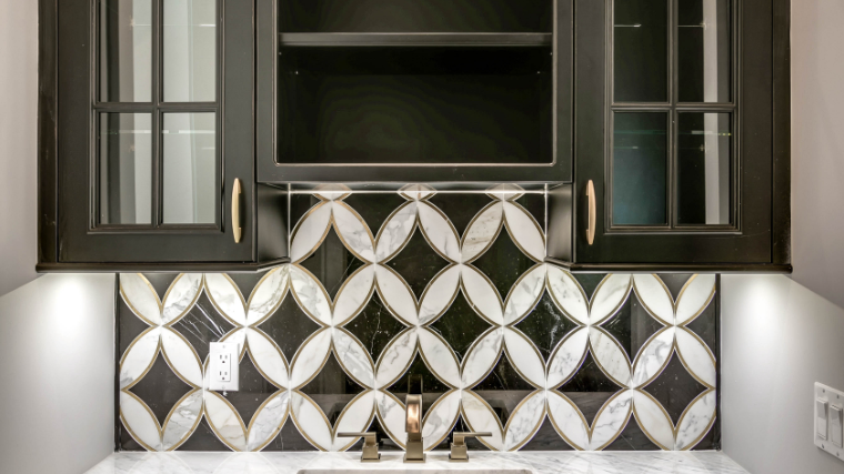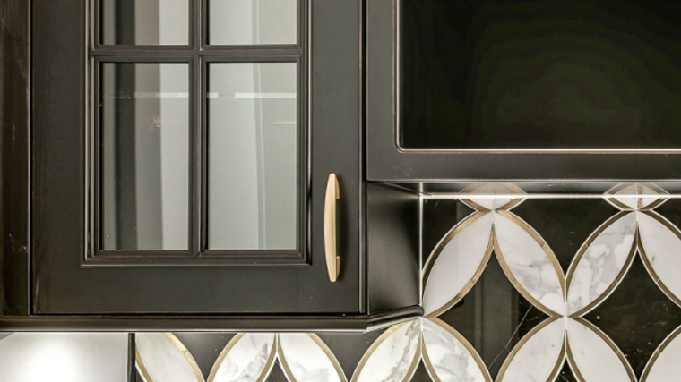 Black, white and gold continues to be a winning combination for art-deco and retro inspired spaces. The designer of this small bar area used the Antique Black finish, which features light distressing and a hand-applied sand-through on the door edges and moldings, to give the cabinetry a weathered and aged appearance. The incorporation of the intricate back-splash, gold hardware and marble counter-top add contrast and complete the look.