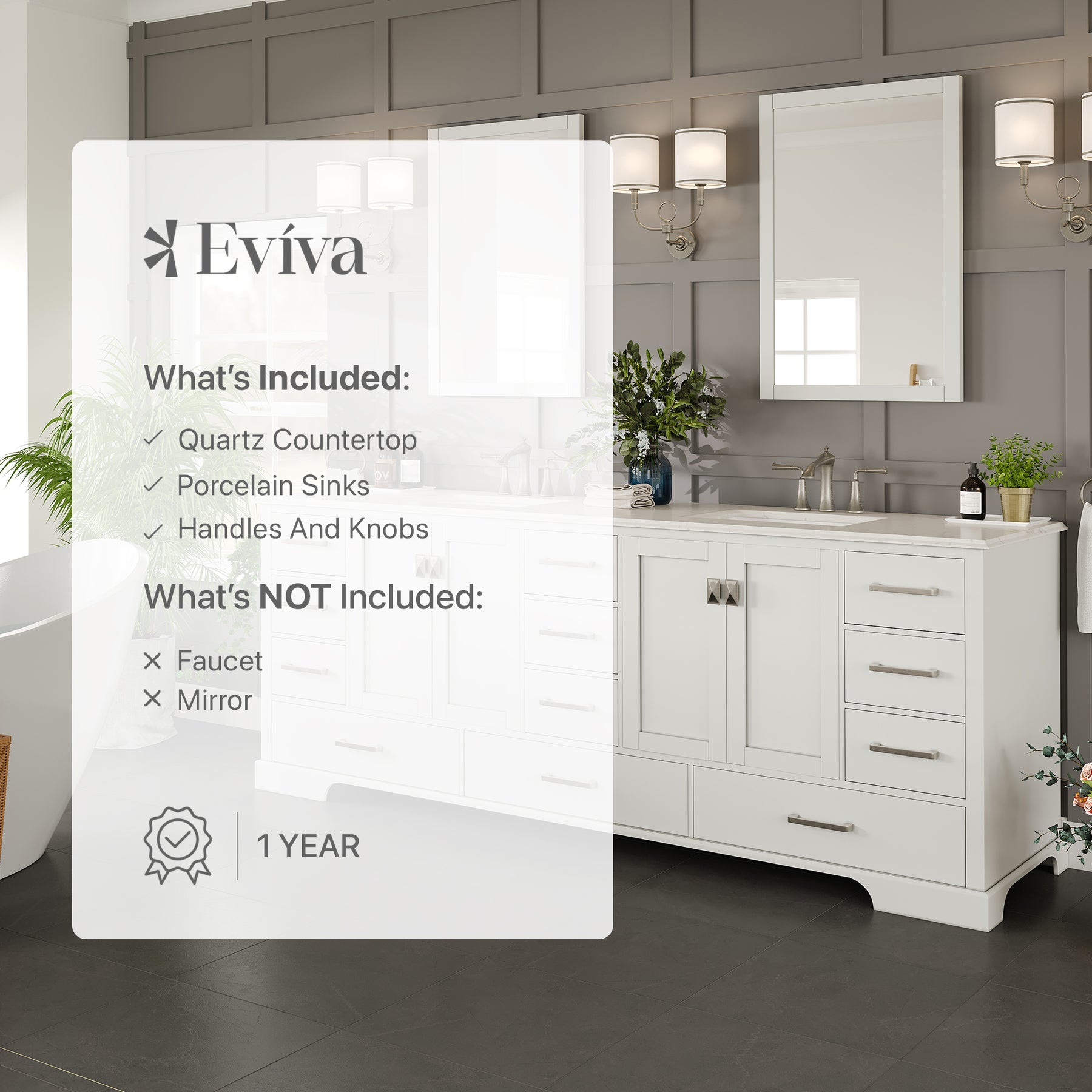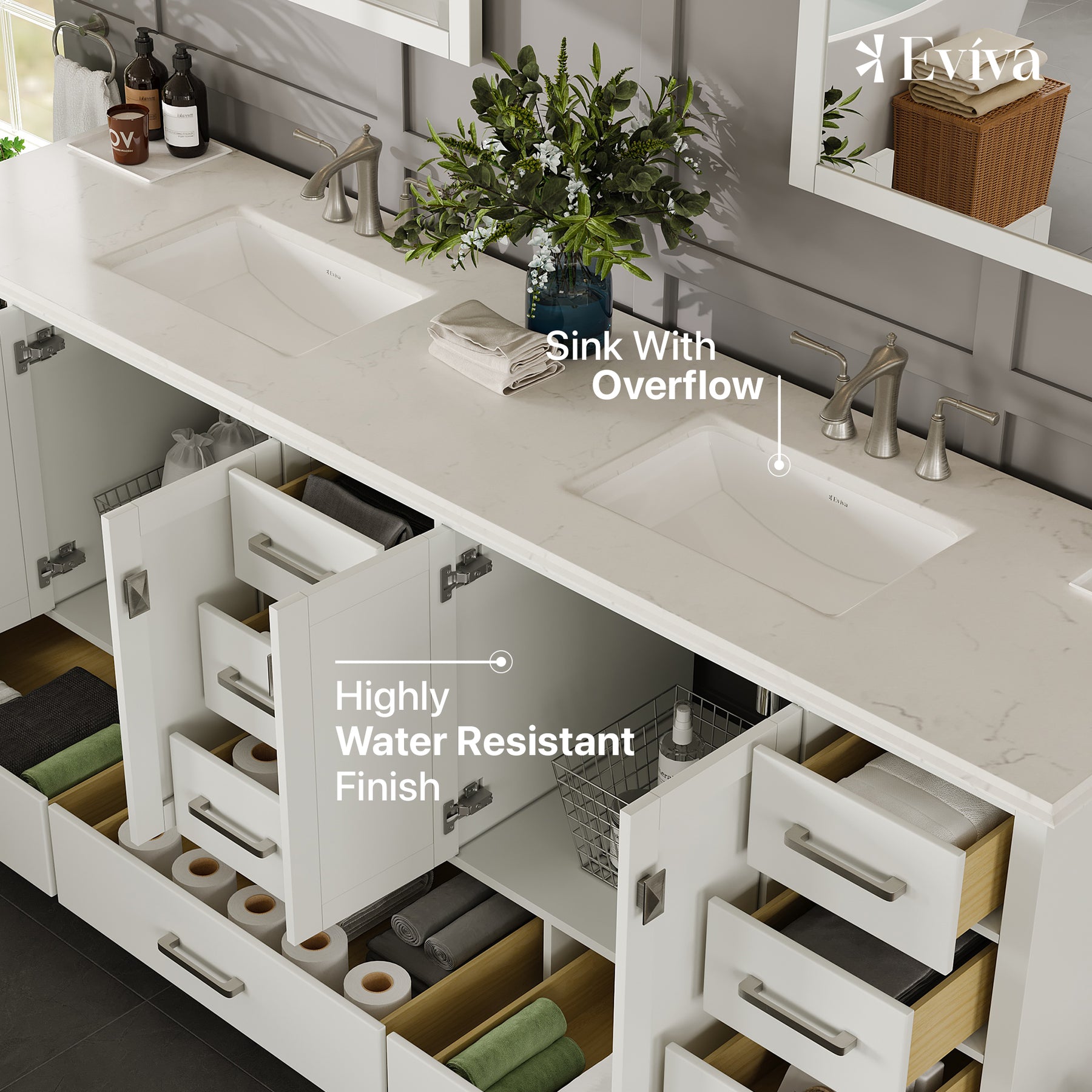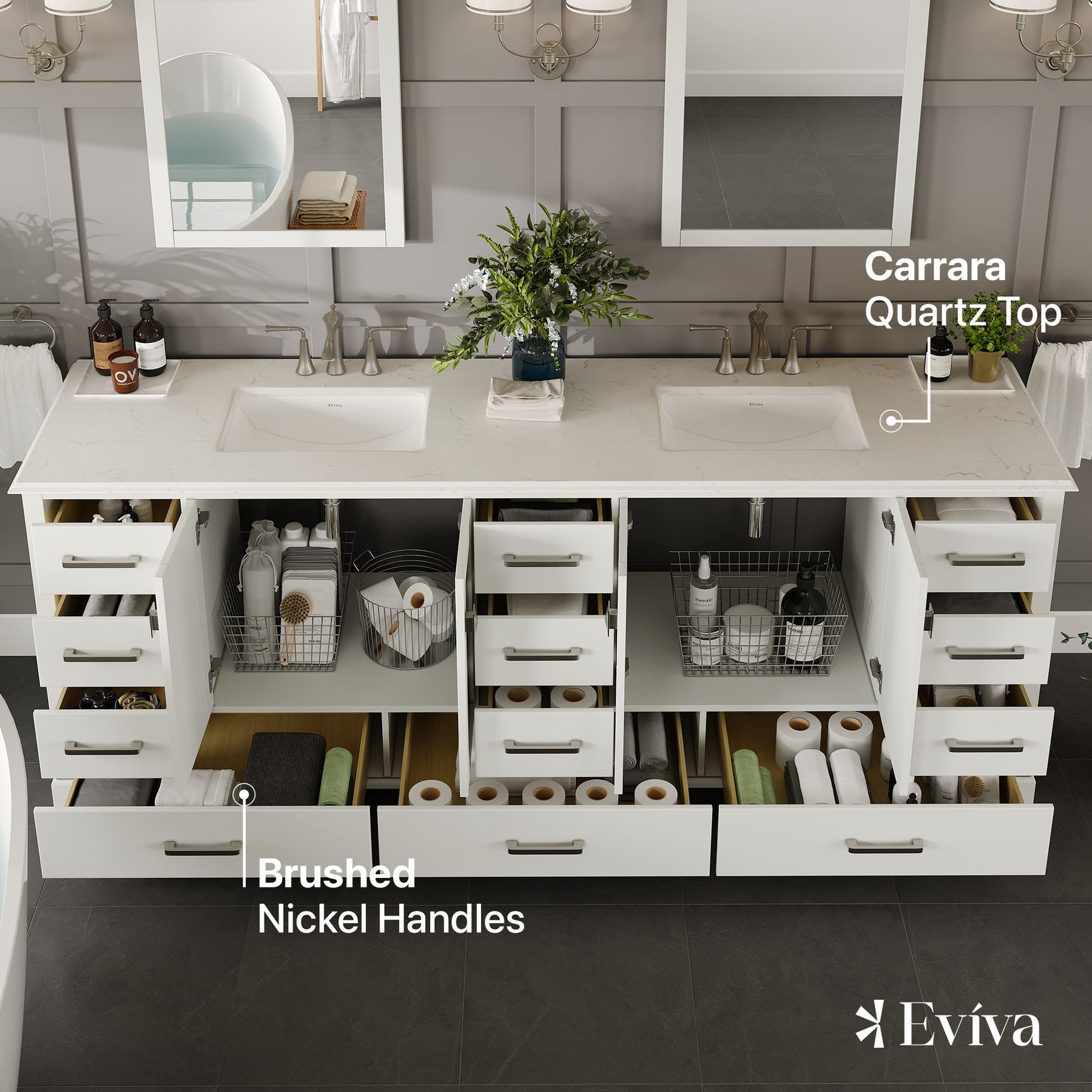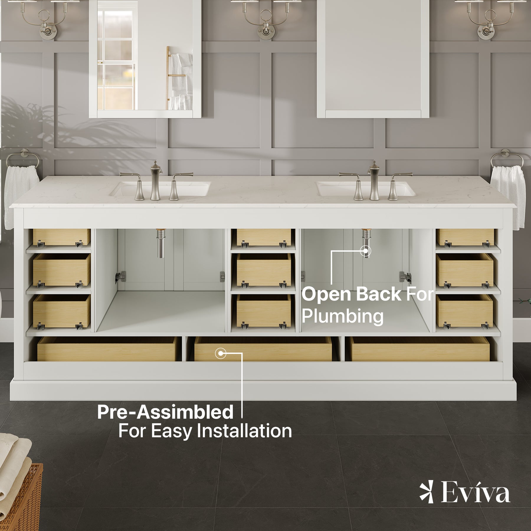 The Eviva Storehouse double sink bathroom vanity is an elegant masterpiece of a traditional style vanity. The Storehouse features a beautiful White Carrara Quartz countertop which is maintenance-free and resists stains and is pre-drilled for a 3-hole 8″ widespread faucet mount and has an undermount porcelain sink. The cabinet is constructed of solid wood which adds to the Storehouse’s extravagant quality and durability. Its 12 soft-closing full-extension solid pine wood dovetail drawers and 4 doors with spacious shelves provide ample storage capacity. The cabinet arrives fully assembled & ready for an easy installation, and comes in a beautiful White or Dark Gray finish.