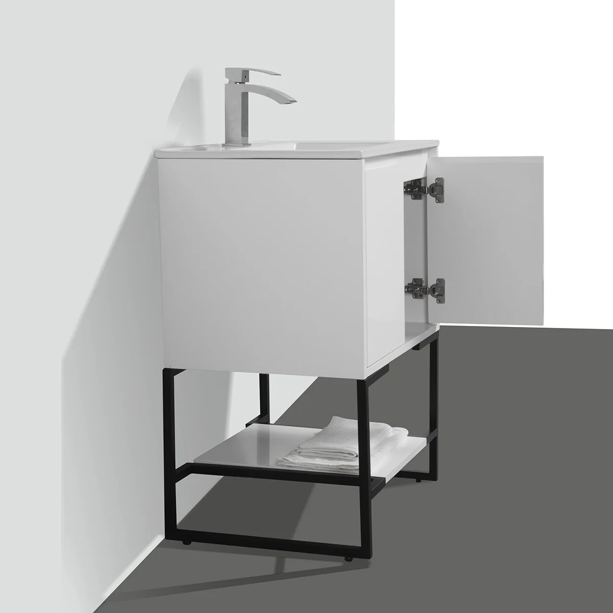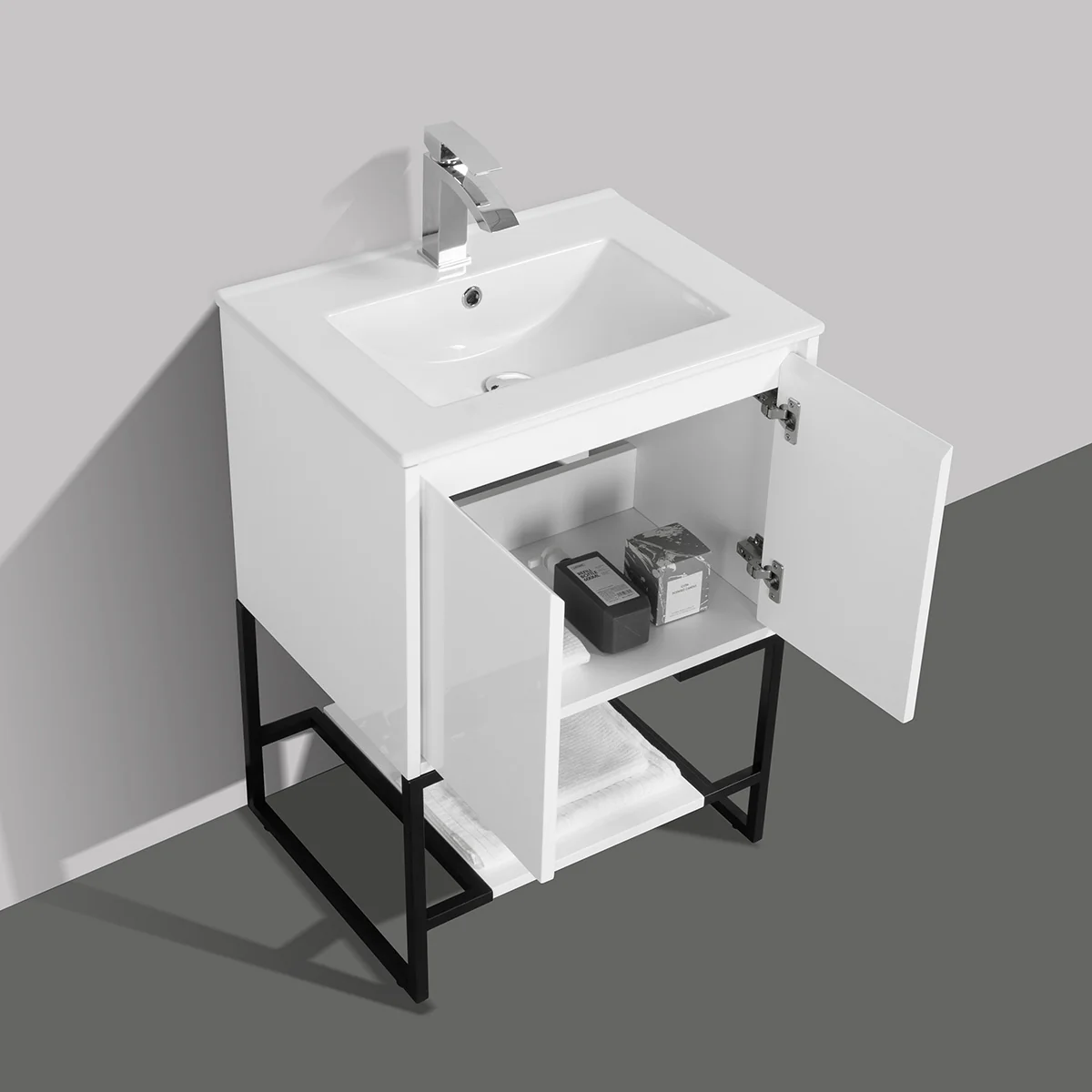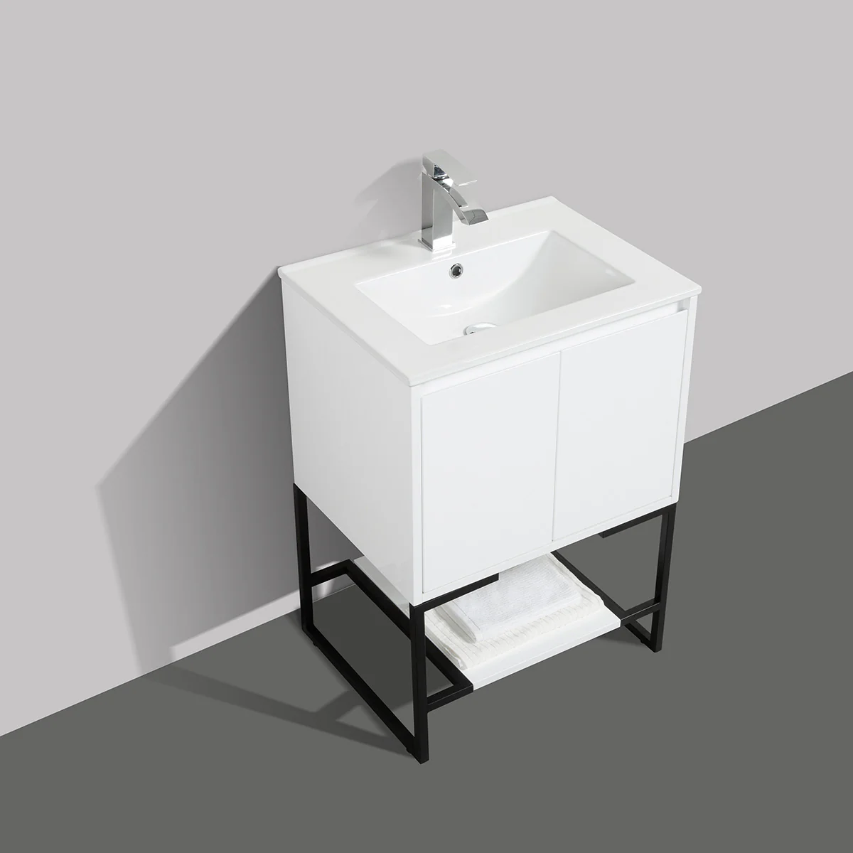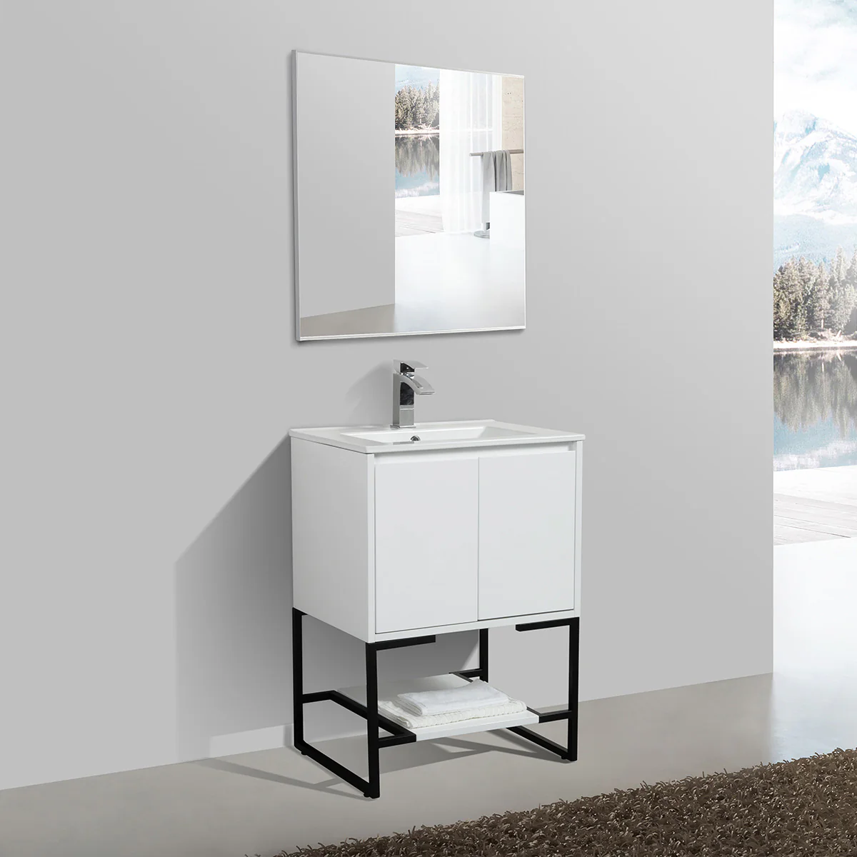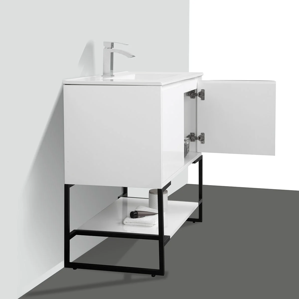 A standing vanity with a ceramic sink, made from all wood materials, featuring soft-closing hinge doors and a spacious shelf for added storage, sounds like a great addition to a bathroom. The option for a matching aluminum medicine cabinet and LED mirror or regular mirror offers customization to complement the vanity’s style and functionality.