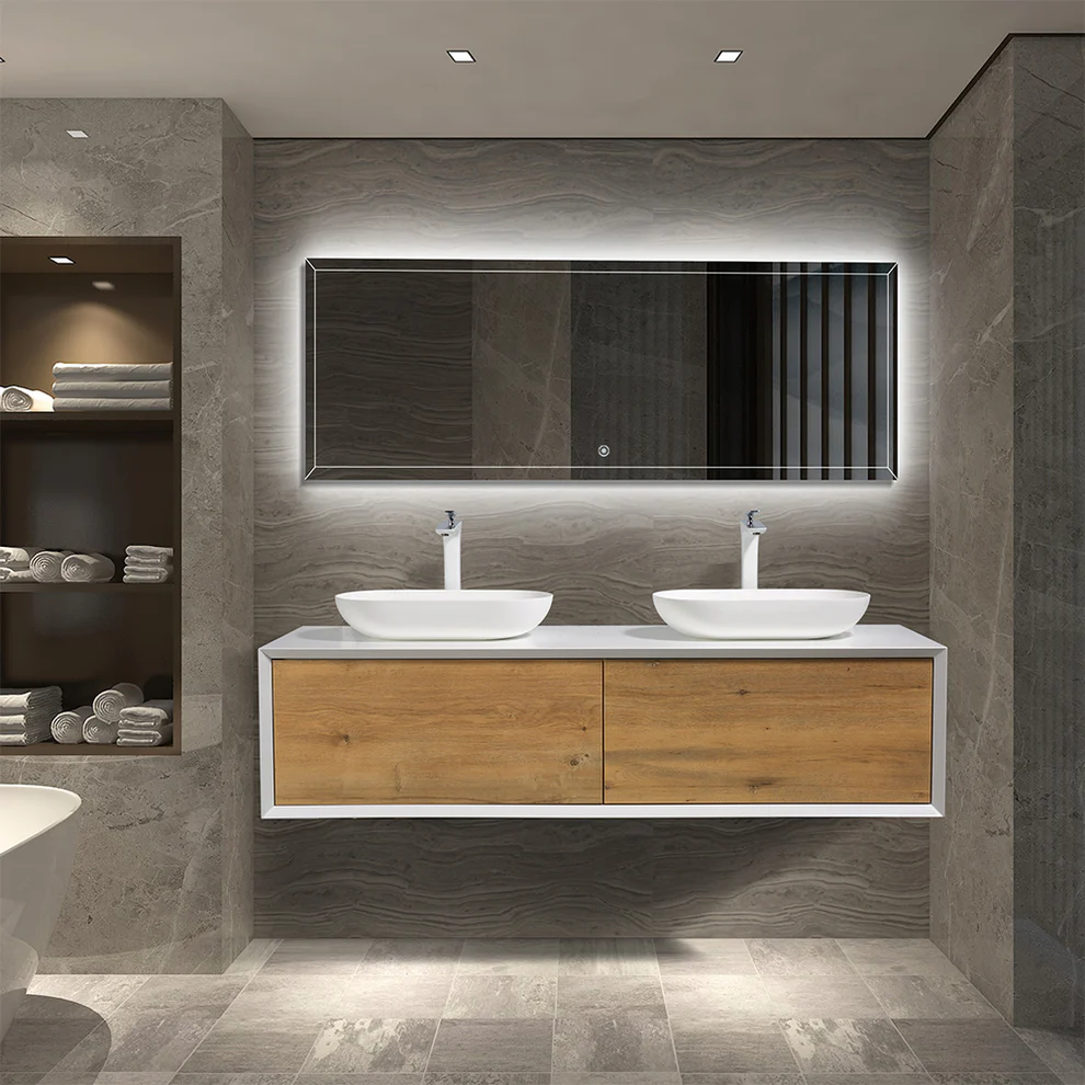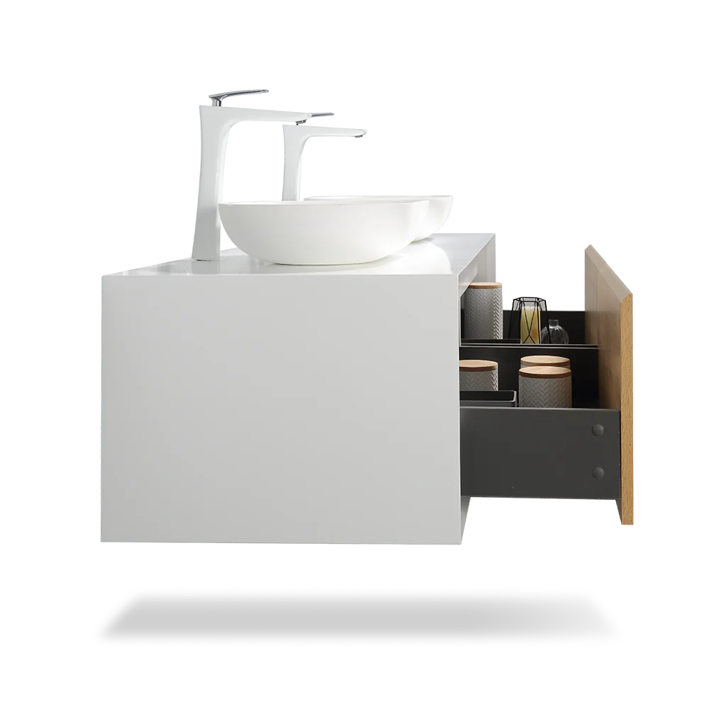 The V9013 series wall mount vanity boasts an all wood construction with acrylic double basin. Its soft-closing cabinet and one drawer offer convenience, while the innovative U-shaped design and 4″ plumbing gap simplify installation. Additionally, there are options for a matching aluminum medicine cabinet and LED mirror or regular mirror to complement the vanity.