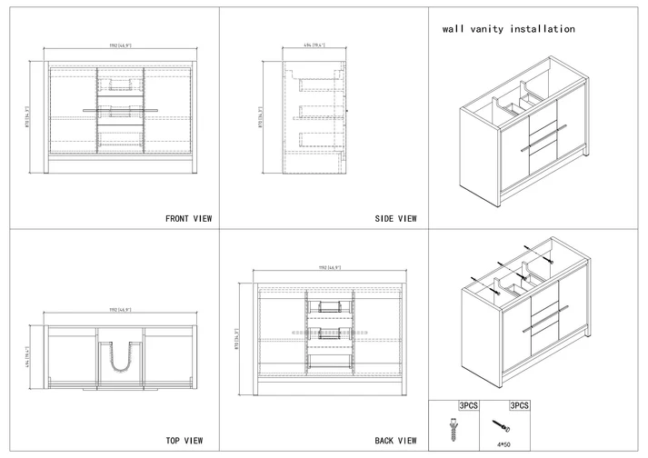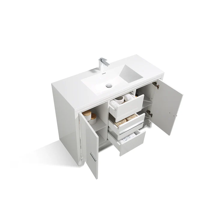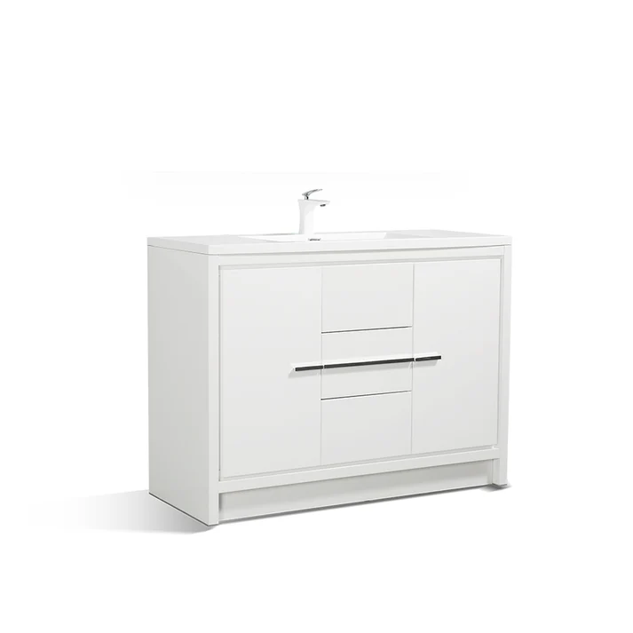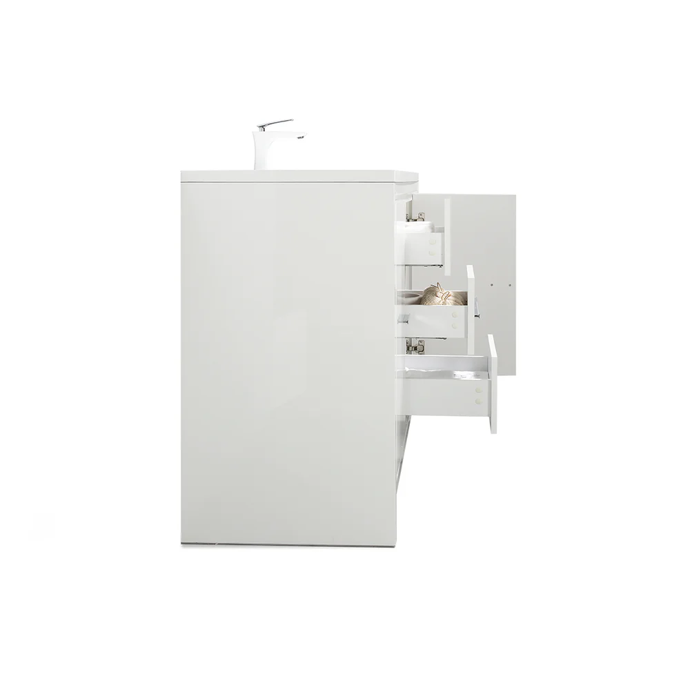 The V9019 series standing vanity features an acrylic basin and a soft-closing cabinet. With doors on both the left and right hinges, it offers ample storage space. The inclusion of two drawers, along with the U-shaped design creating a 4″ gap between the wall and drawers, ensures easy plumbing installation. Additionally, there are options for a matching aluminum medicine cabinet and LED mirror or regular mirror to complement the vanity.