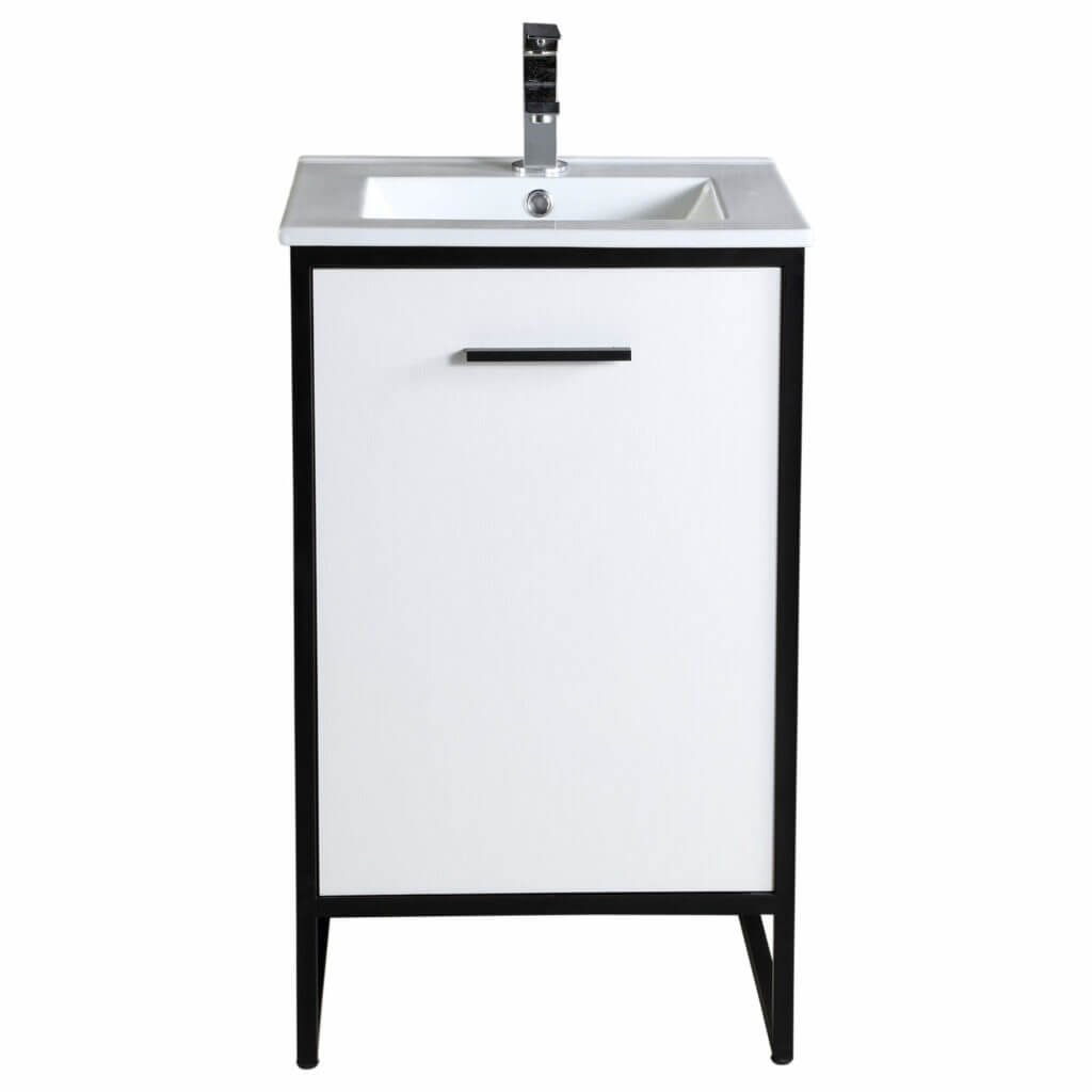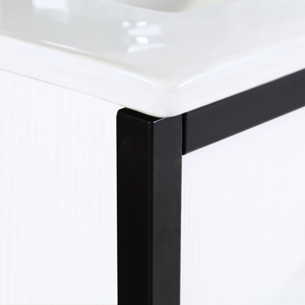 Vdara’s striking, modern look will beautify any space in which it is placed. Its simplicity underscores its beauty, with a sleek metal frame lending the vanity an imperial bearing. The four melamine finishes—Dawn Gray, White Straight Grain, and Gray Taupe—complete the plywood construction for a durable, long-lasting vanity. The Dawn Gray finish is accented with a white steel frame, while the other three color options feature a black steel frame.