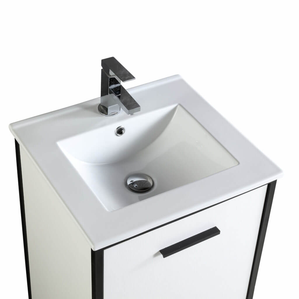 The complementing mirrored medicine cabinet is available in a Black or Dawn Gray melamine finish. The vanity cabinet opens up to reveal plenty of usable storage space, and the slim, grade AAA vitreous china sink blends into the vanity beautifully, unifying the collection into one seamless piece. Vdara is offered in 20”, 24”, and 30”, enabling the vanity with a ubiquitous style to fit into various sized bathrooms.