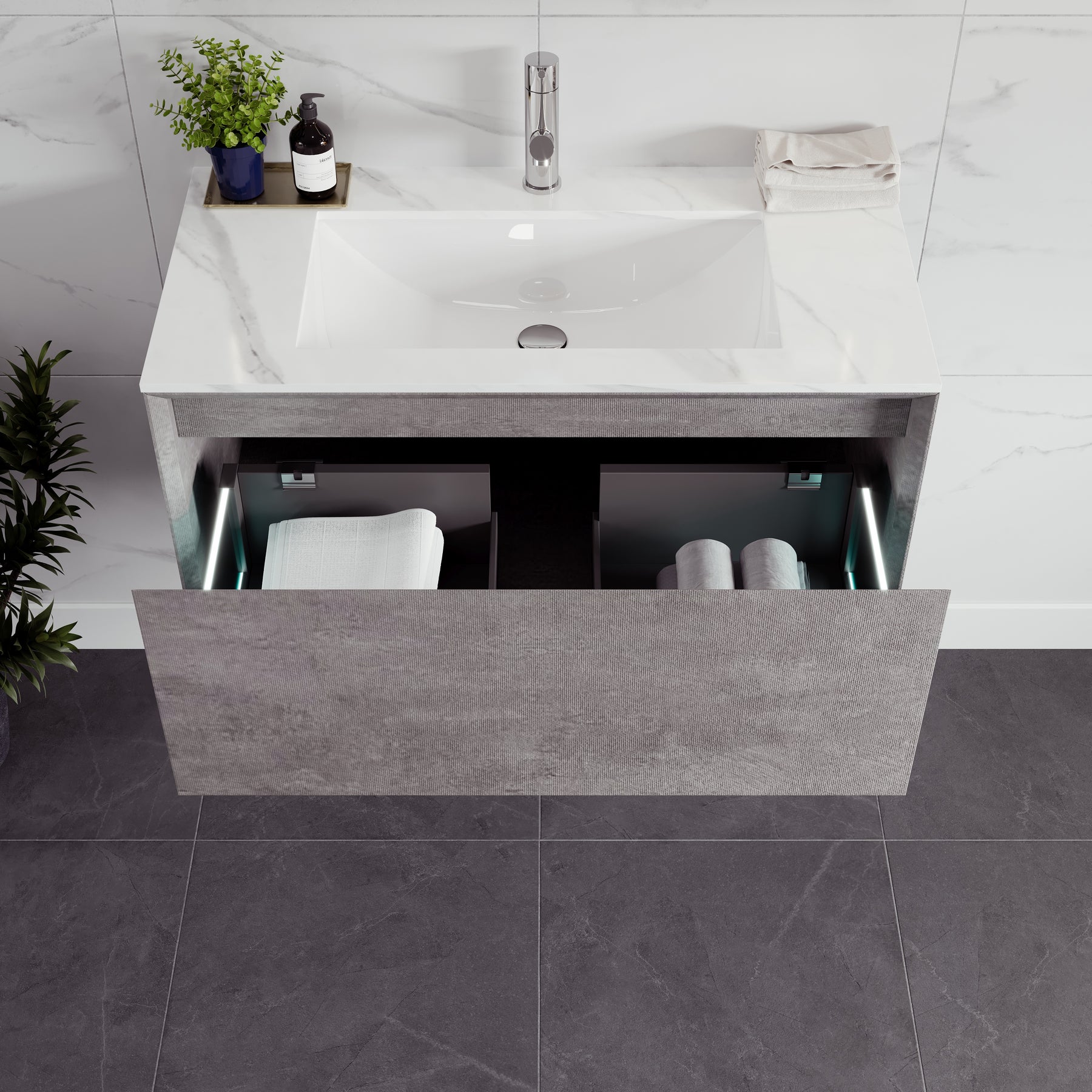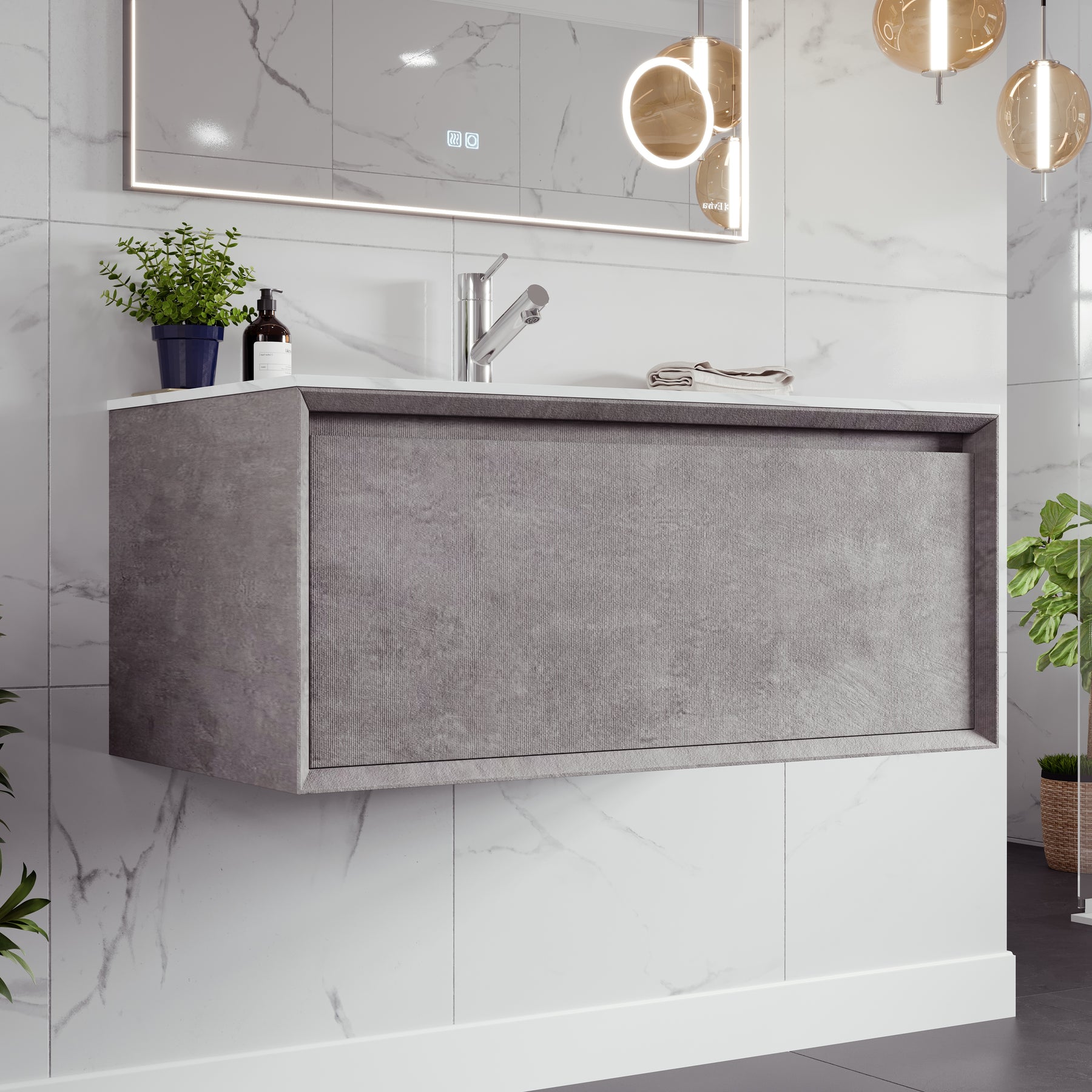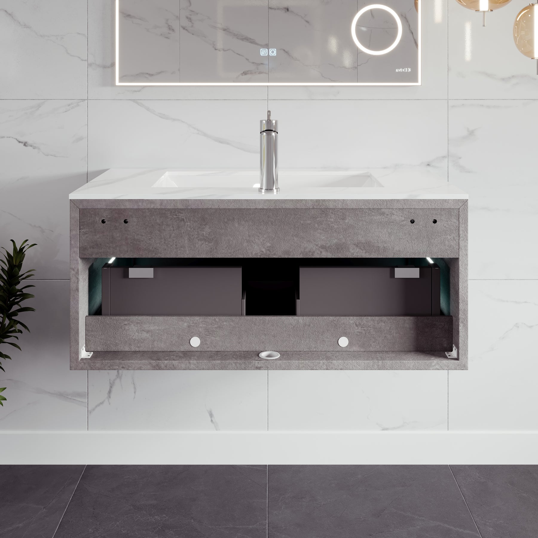 The Eviva Vista wall-mounted bathroom vanity features a modern, smoothly flowing design, with a stain-resistant & maintenance-free White Carrara Quartz countertop with an undermount porcelain sink and pre-drilled single faucet hole. It is constructed of high-grade engineered wood to prevent warping and chipping and last a lifetime. The cabinet has a beautiful, realistic textured Cement Gray finish, adding to the vanity’s depth and feel. The Vista’s unique & modern single drawer design with the sides of the drawer made out of Transparent glass provides ample storage space for your essentials. The soft-closing full extension drawers prevent slamming, and include a smooth handle free design pull allowing for a comfortable and luxurious experience. The cabinet arrives fully assembled for easy installation, and the countertop and sink are left unassembled for ease of transportation and installation. The Vista is available in widths of 36″, 40”, 48″, and 60″ with a depth of 23″ in beautiful textured Concrete Gray finish, while the 60 inch model is available in both single and double sink options.
