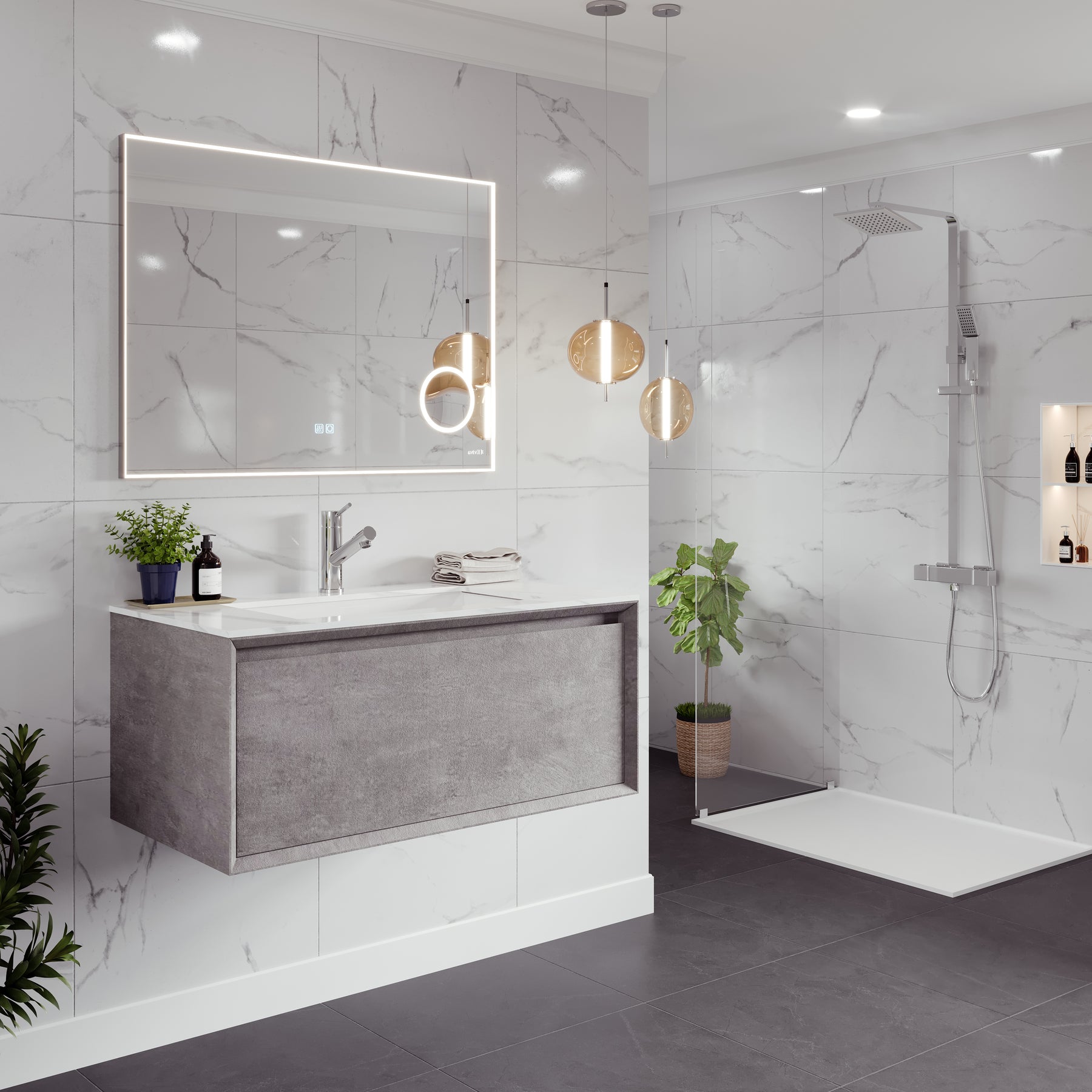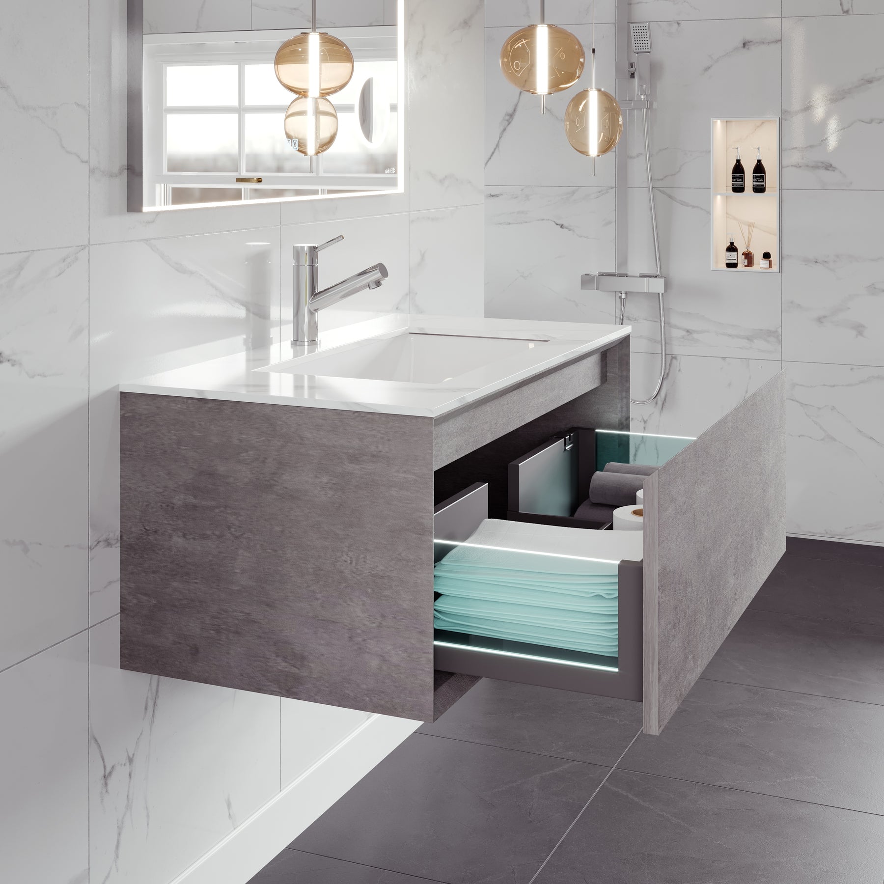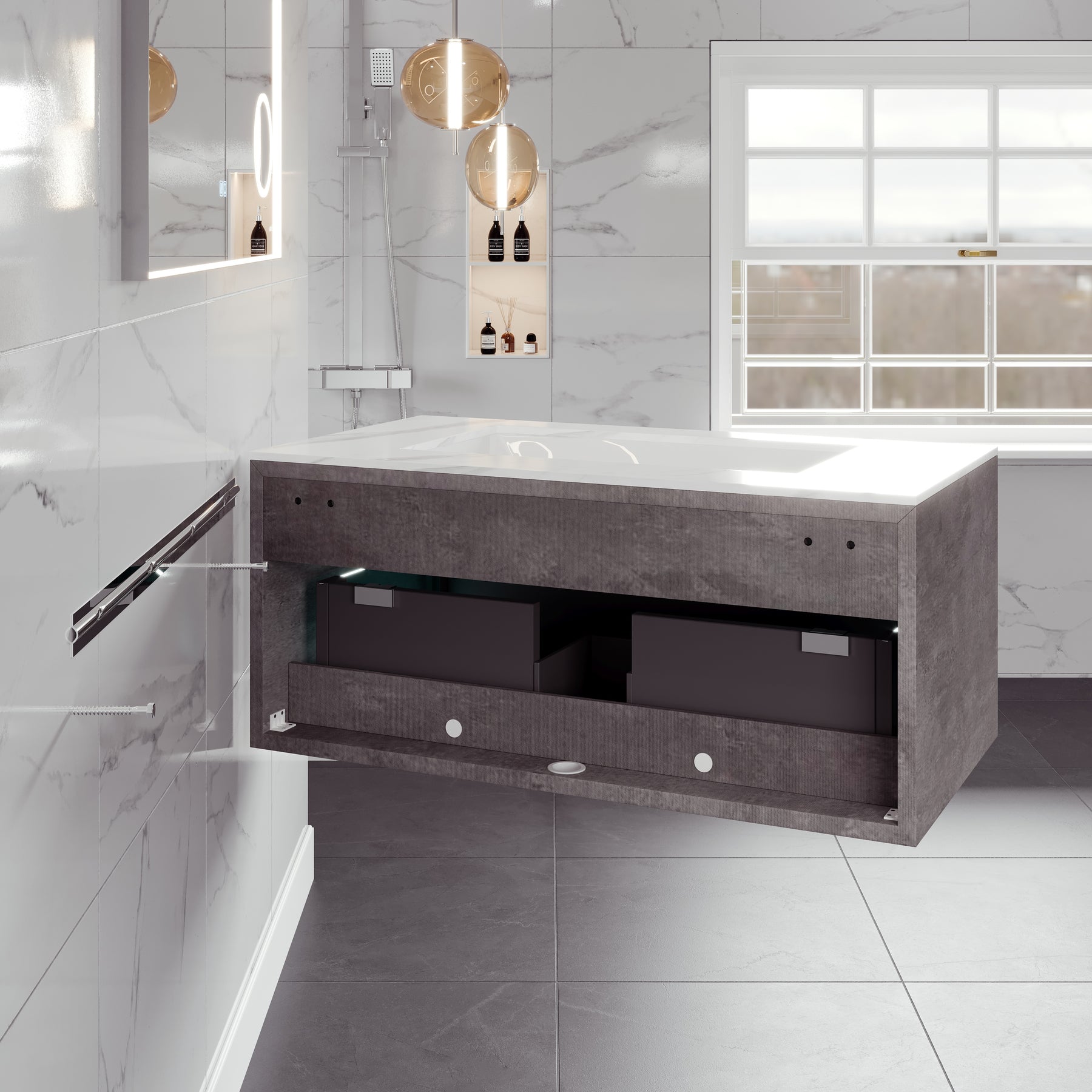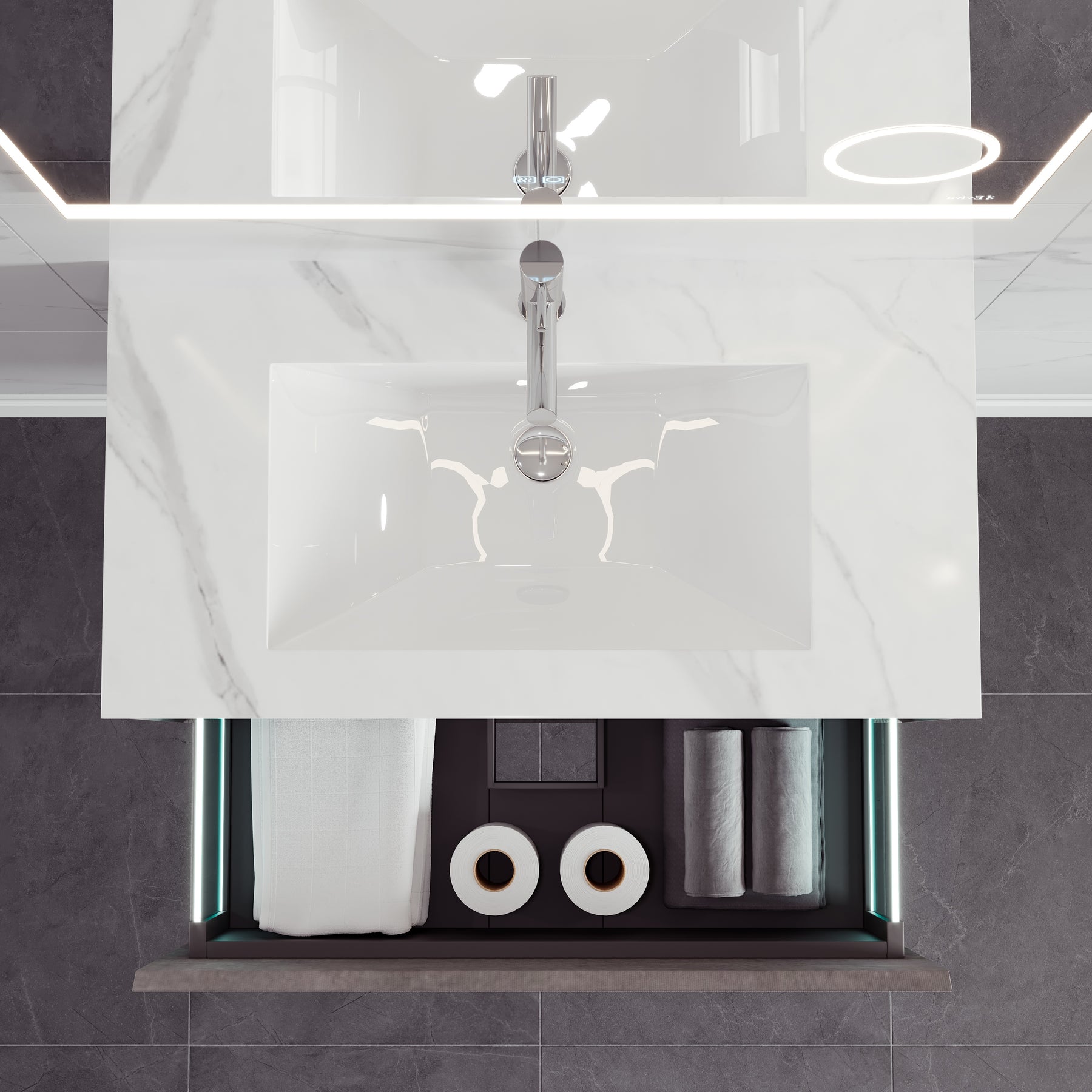 The Eviva Vista wall-mounted bathroom vanity features a modern, smoothly flowing design, with a stain-resistant & maintenance-free White Carrara Quartz countertop with an undermount porcelain sink and pre-drilled single faucet hole. It is constructed of high-grade engineered wood to prevent warping and chipping and last a lifetime. The cabinet has a beautiful, realistic textured Cement Gray finish, adding to the vanity’s depth and feel. The Vista’s unique & modern single drawer design with the sides of the drawer made out of Transparent glass provides ample storage space for your essentials. The soft-closing full extension drawers prevent slamming, and include a smooth handle free design pull allowing for a comfortable and luxurious experience. The cabinet arrives fully assembled for easy installation, and the countertop and sink are left unassembled for ease of transportation and installation. The Vista is available in widths of 36″, 40”, 48″, and 60″ with a depth of 23″ in beautiful textured Concrete Gray finish, while the 60 inch model is available in both single and double sink options.