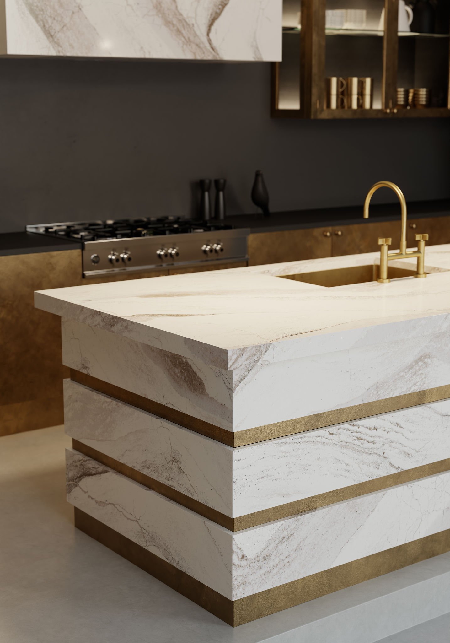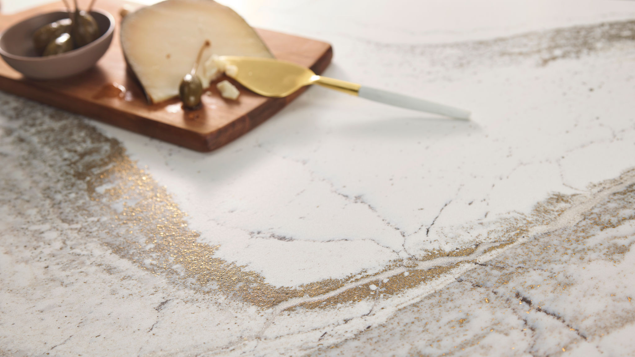 Captivating textures reach new heights—and depths—in this design. Chocolate brown hues and warm honey shading play against delicate debossed Inverness™ veins. Radiant brass complements this stony canvas with subtle warmth, smooth movement, and unmatched sheen.